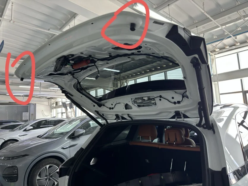 就是红圈里两个旋钮松了,导致后备箱发生异响!现在我的车没有异响了,在这我要向九亭小鹏的售后技术师傅致谢,谢谢你们!你们很专业,九亭小鹏售后也很暖心!最后还帮我洗车了,真的太棒啦!