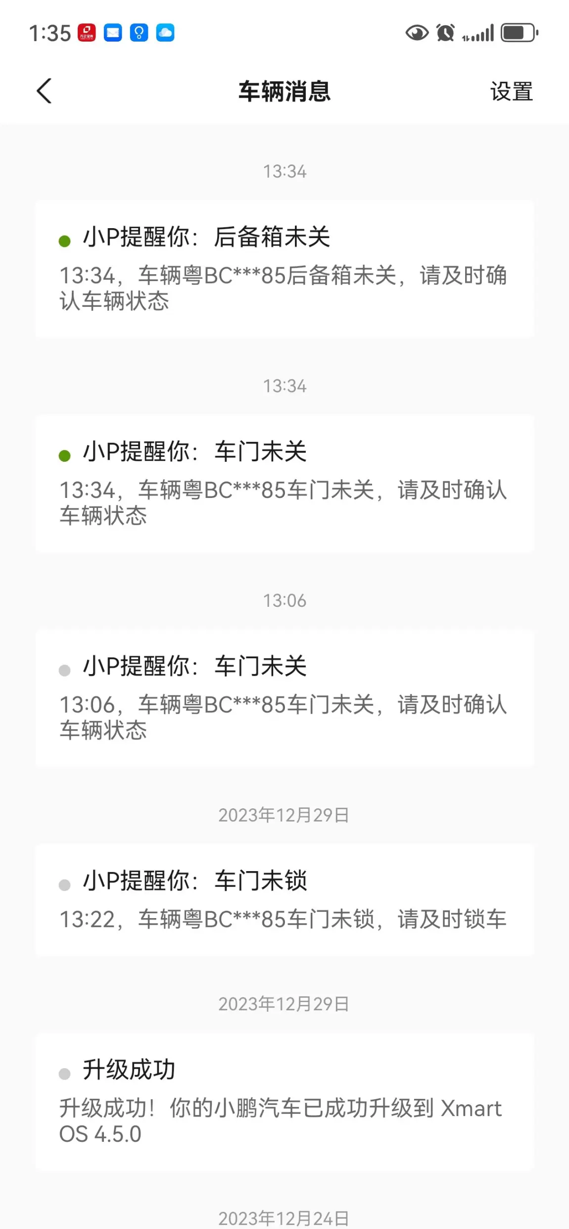 2.开启洗车模式后,APP会一直推送门没关,后备箱没关。