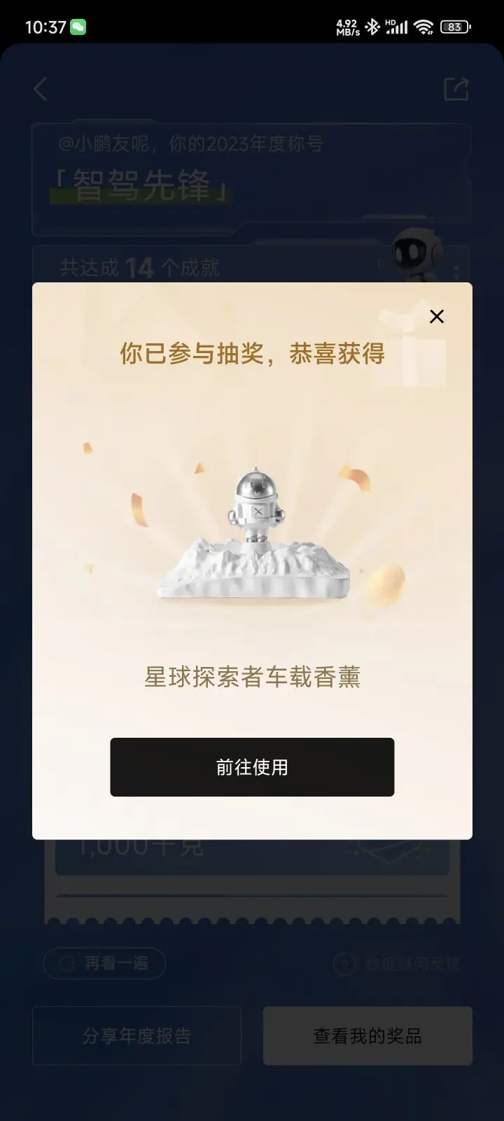 总之,获得小鹏汽车这份新年礼物让我非常开心和感动。这个星球探索者车载香薰不仅是一件精美的装饰品,更是一种对用户的关怀和对未来出行的美好愿景。我会珍惜这份礼物,并期待小鹏汽车在未来能带给我们更多的惊喜和创新!