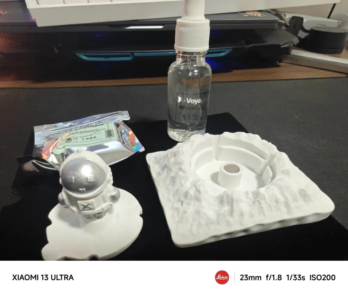 这个车载香薰的设计灵感来源于宇宙星球,它的外观非常独特,里面有两个相片,一个底座加一个宇航员,还有一支探月计划补给包,整体看上去仿佛是一个缩小版的宇宙飞船,极具科幻感。这个设计让我感受到了小鹏汽车对创新和未来的追求。