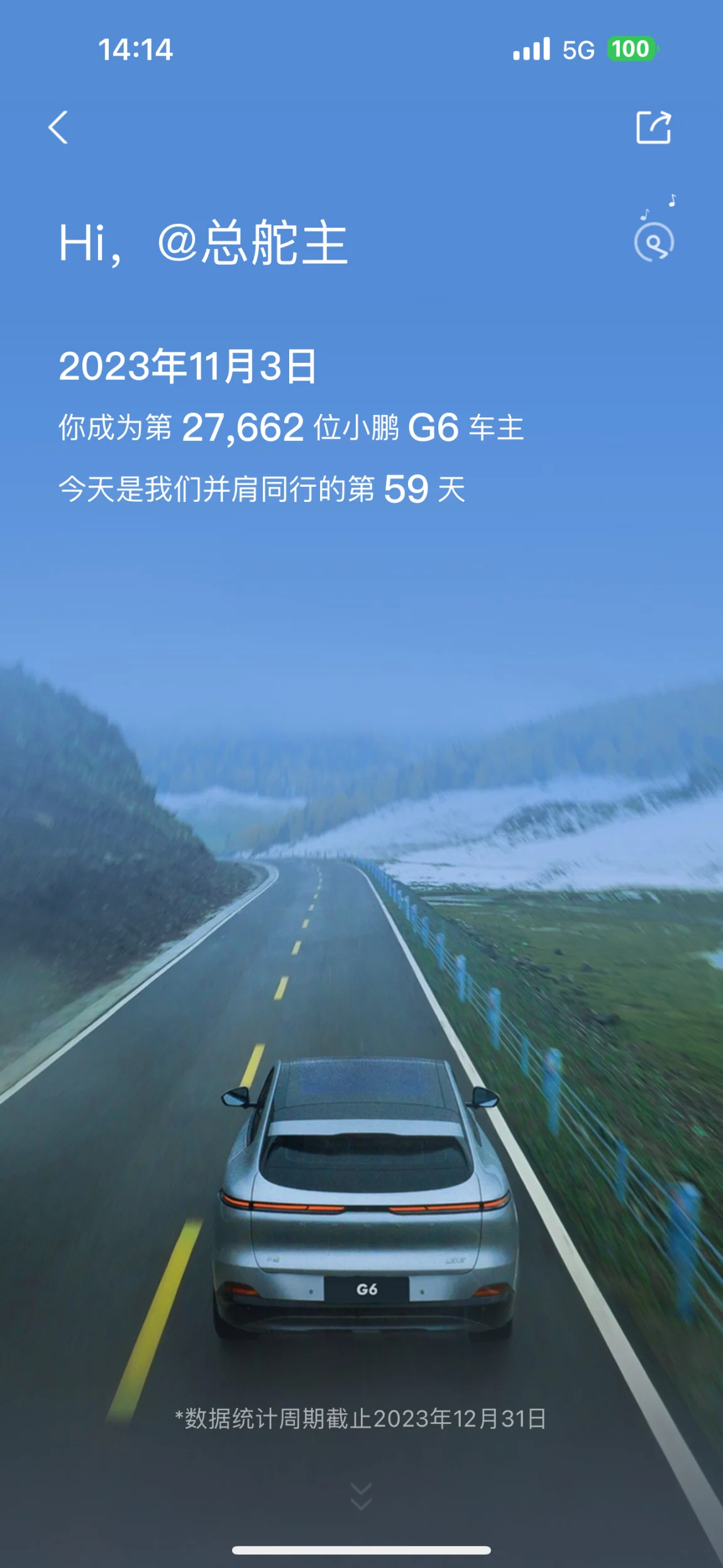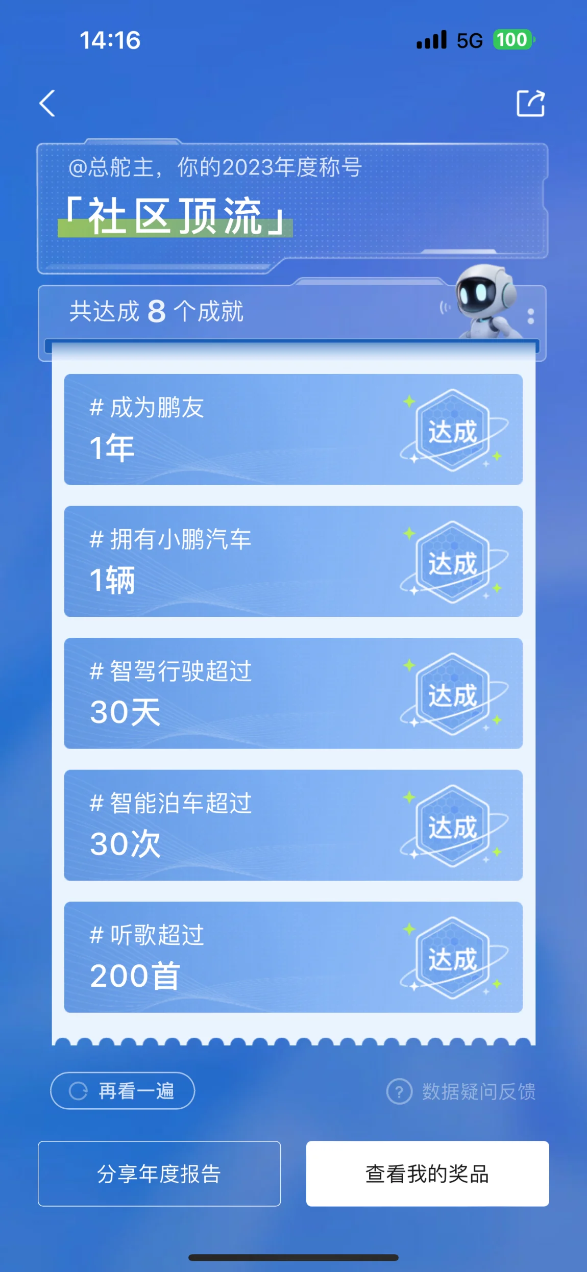 2023年在小鹏汽车的陪伴下,在App中荣获了不少勋章,见证了我在用车过程中的成长。此外,我对2024年充满期待,希望小鹏汽车能为用户带来更高品质的出行生活。