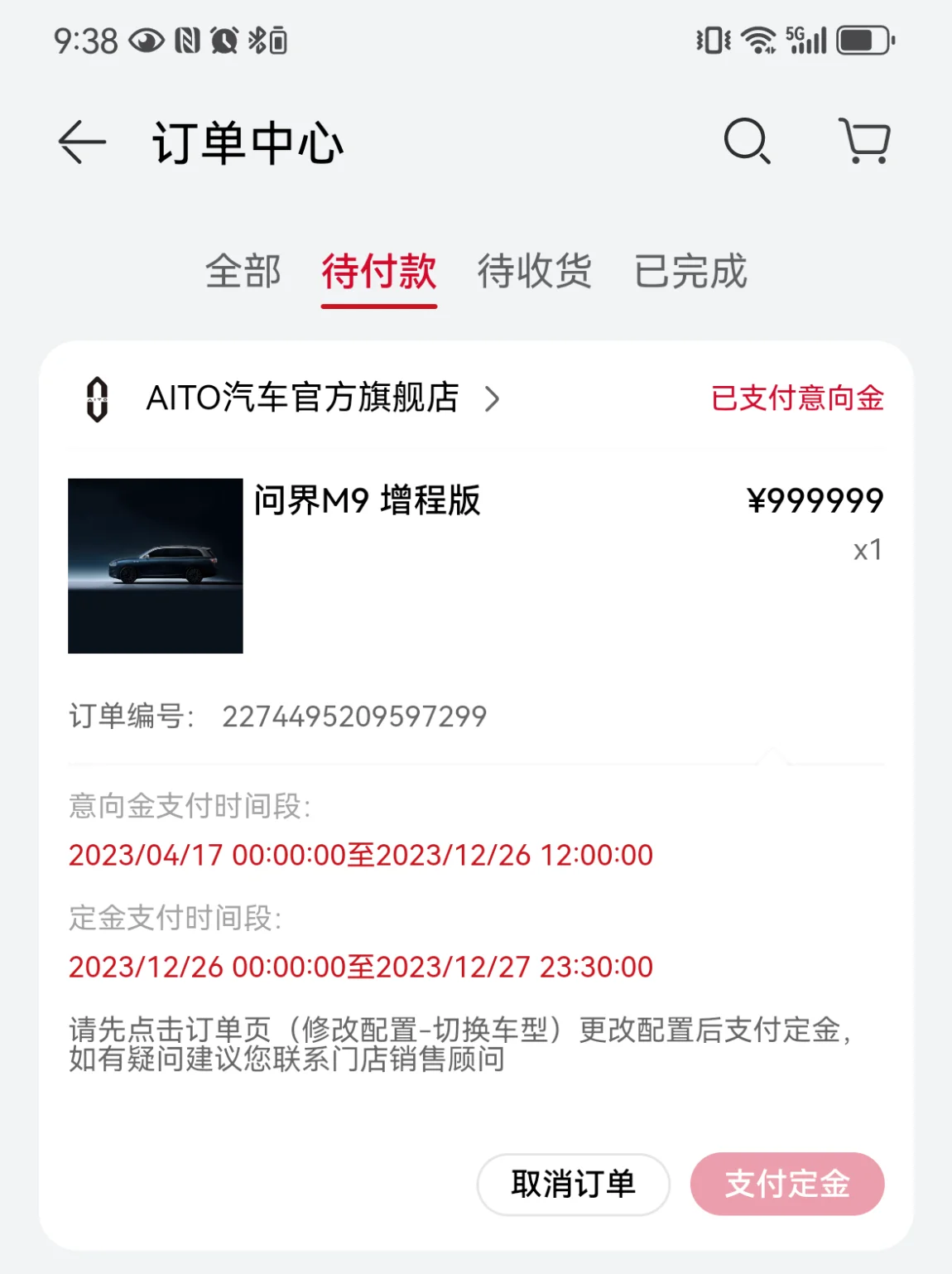 我本来有一辆7座SUV途昂,起步差点意思,开过电动车一比较,那起步是差太多意思了。想着关注一下电动7座SUV。之前重点关注华为M9,是个7座SUV,内心是比较喜欢华为的产品,手机也是华为,智能家居也是华为,内心是想支持国产领袖华为的,有那么一点点情节,也在去年国庆节后盲订了M9,并支付了订金。