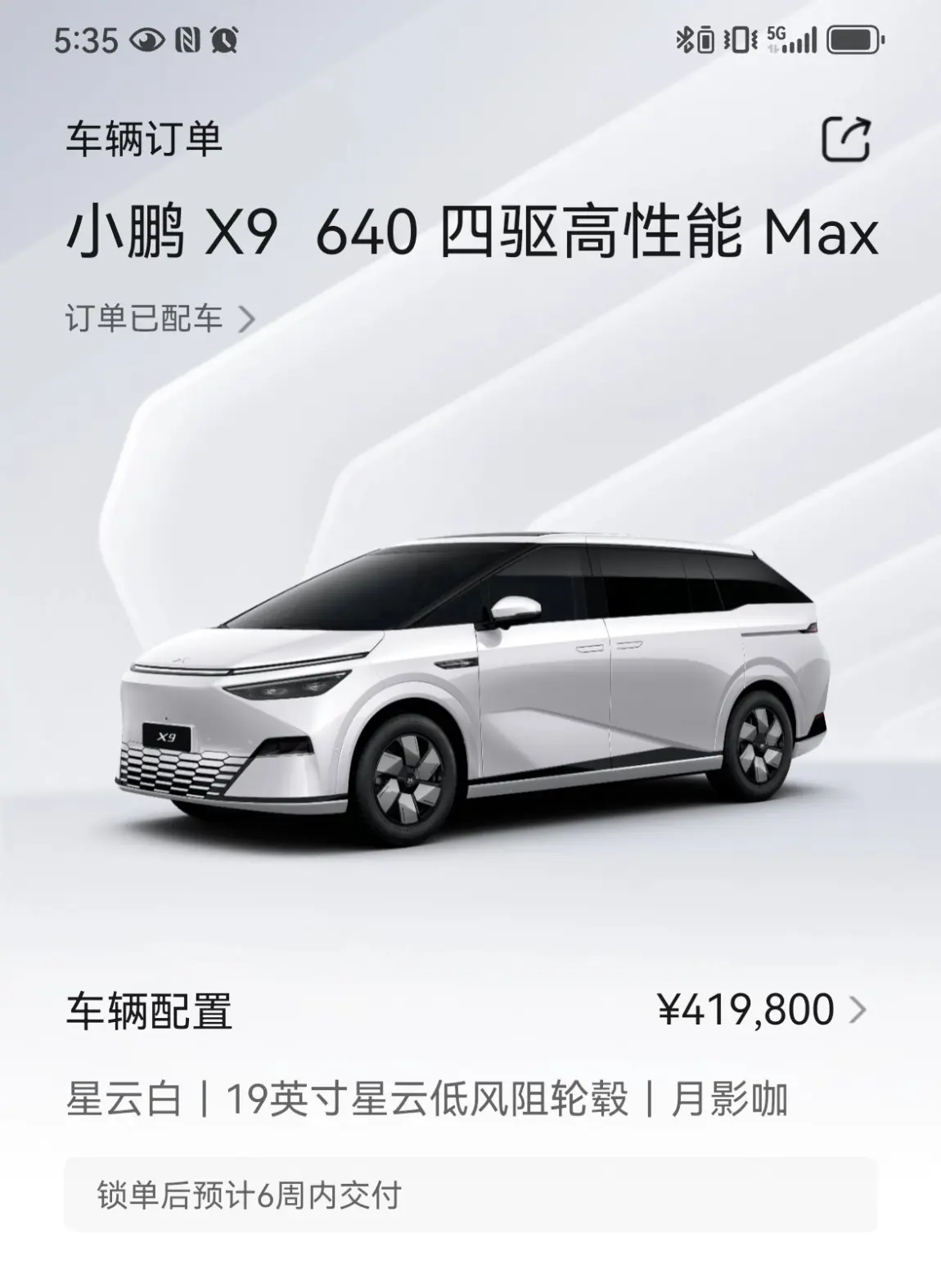 我选的车型是小鹏X9四驱640max 白外咖内过道版,今天是个特别的日子,第一次发帖,分享一下喜悦,也分享一下订车到配车的过程