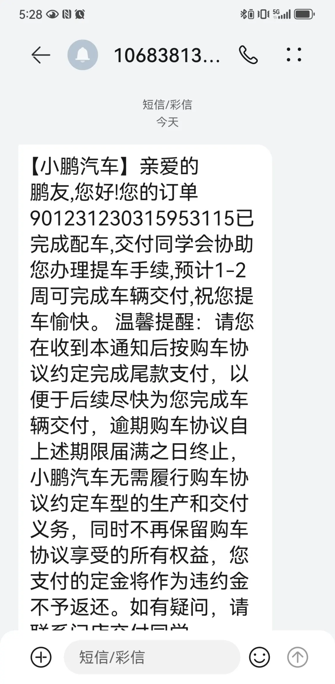锁单后才知道销售顾问的建议是正确的,要提前锁单才能提前配车的,在大定群里大家都在比较着锁单时间,大家都关注着配车进度,大家都期待着提车,很多小伙伴想着春节前能用上爱车,我也一样,想着可以用上新X9,带着小孩回趟老家,路上再玩几个景点,平时读书太辛苦了,放松一下见见外面的世界涨涨见识......。锁单后那真是一天都要打开小鹏APP好几次呀,看看订单是否变态,然而它自岿然不动,陆续听闻群里小伙伴订单开始配车了,白内的配车了、黑内配车了,咋咖内的都没配车?两驱610配车了,两驱702配车了咋四驱640还没有配车?内心那是苦苦煎熬呀......去年底深圳等地地补还比较诱人,想着可以去深圳提车节约一万多米,之前还念叨着那些城市地补目前各地地补政策基本没出来,算了能早点提车那些地补就不想啦。有时候幸福就是来得那么的突然:今天(2023年1月15日)上午9:14收到销售顾问微信通知将在本月18日配车,好happy呀,马上去小鹏APP上看,但还没有更新订单状态还是锁单状态,随后也接到交付专员电话说本月18日配车......
