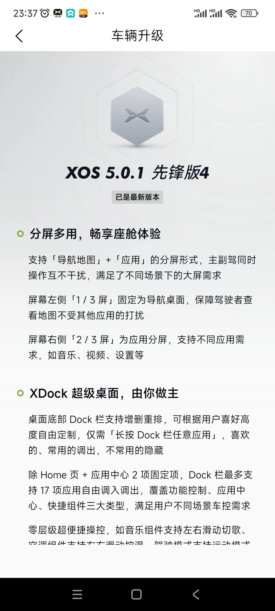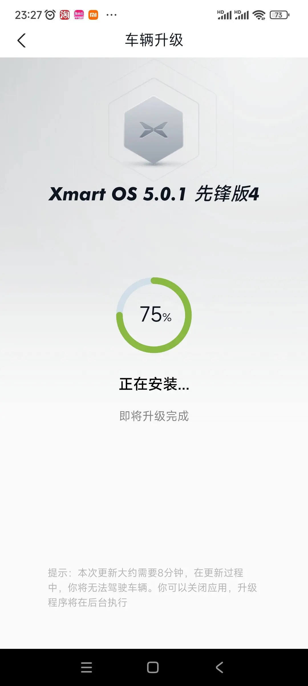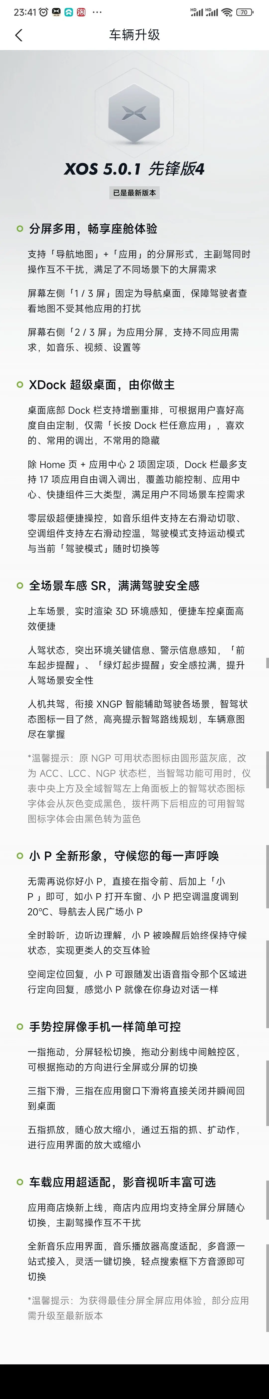开心😁晚上收到xmart os5.01 先锋版4升级提示立马在手机上确认升级,期待明天上车体验。鹏厂ota升级确实很好,不画饼。