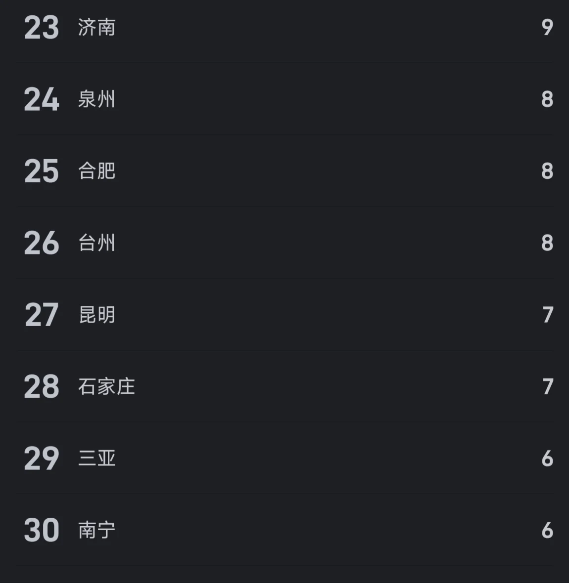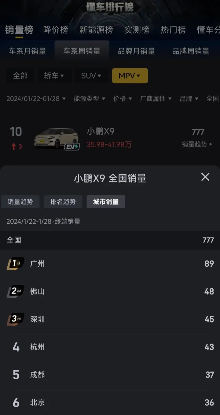 小鹏X9城市销量排行榜2024/1/22-1/28