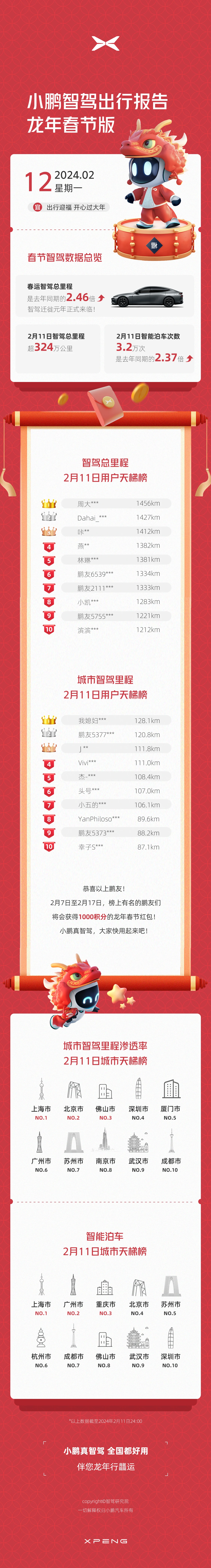 鹏友们新年好!小鹏智驾出行报告春节不打烊!2月11日大年初二,全国单日智驾总里程突破320万公里,创下近三周以来的新高!小P斗胆猜测,鹏友们应该都是回娘家、走亲戚才跑出来怎么高的智驾里程吧(手动狗头表情)有智驾跟您一起拜年,红包都能多收几个(手动狗头表情)小鹏真智驾全国都好用 ,助力鹏友春节智能出行~