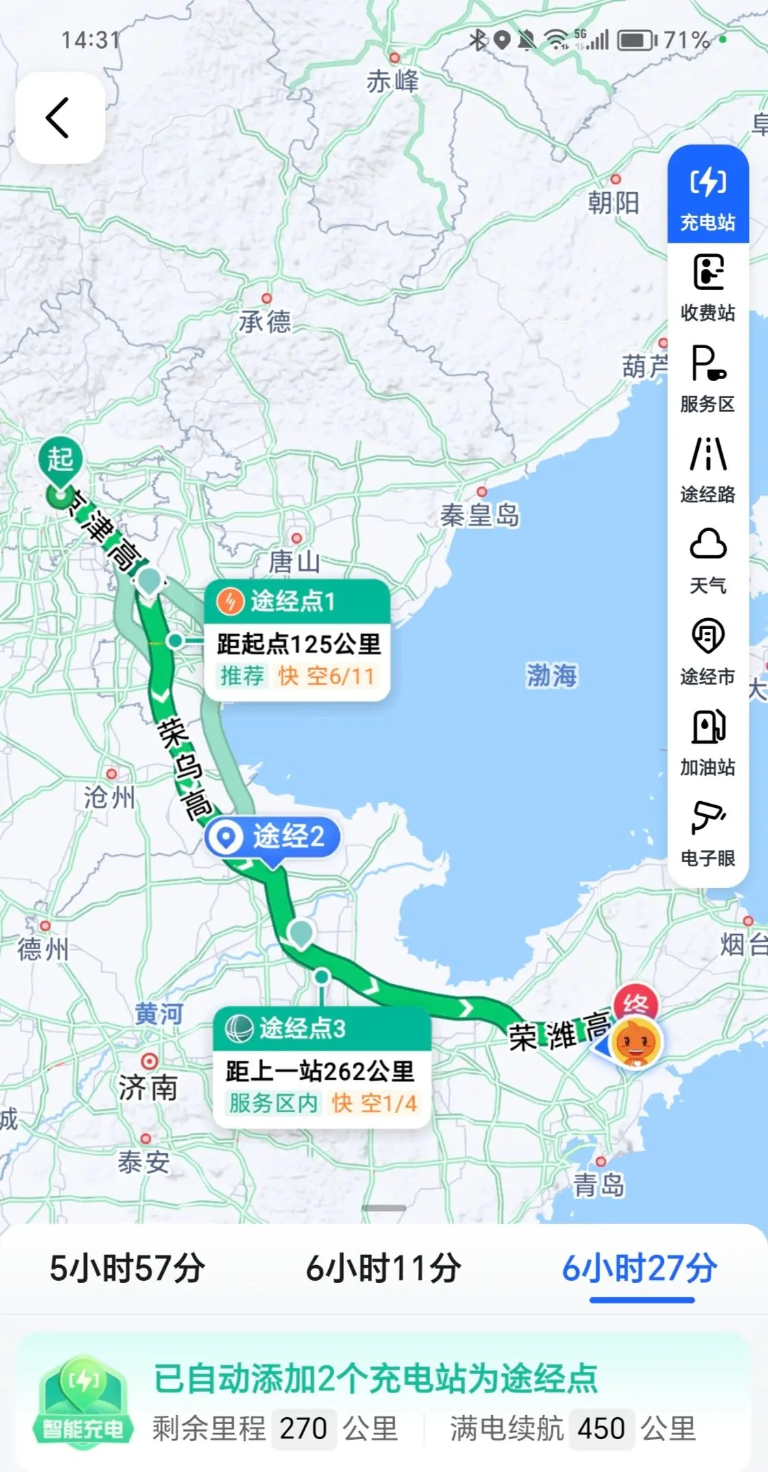 这是我第一次开电车出长途,所以在出发前用高德地图研究了半天在哪个服务区充电,那个服务区充电桩多。也看过好多人的电动车高速出行功略,所以打着剩下100公里的时候就去充电。事后看这个办法还是可行的,但还可以优化。