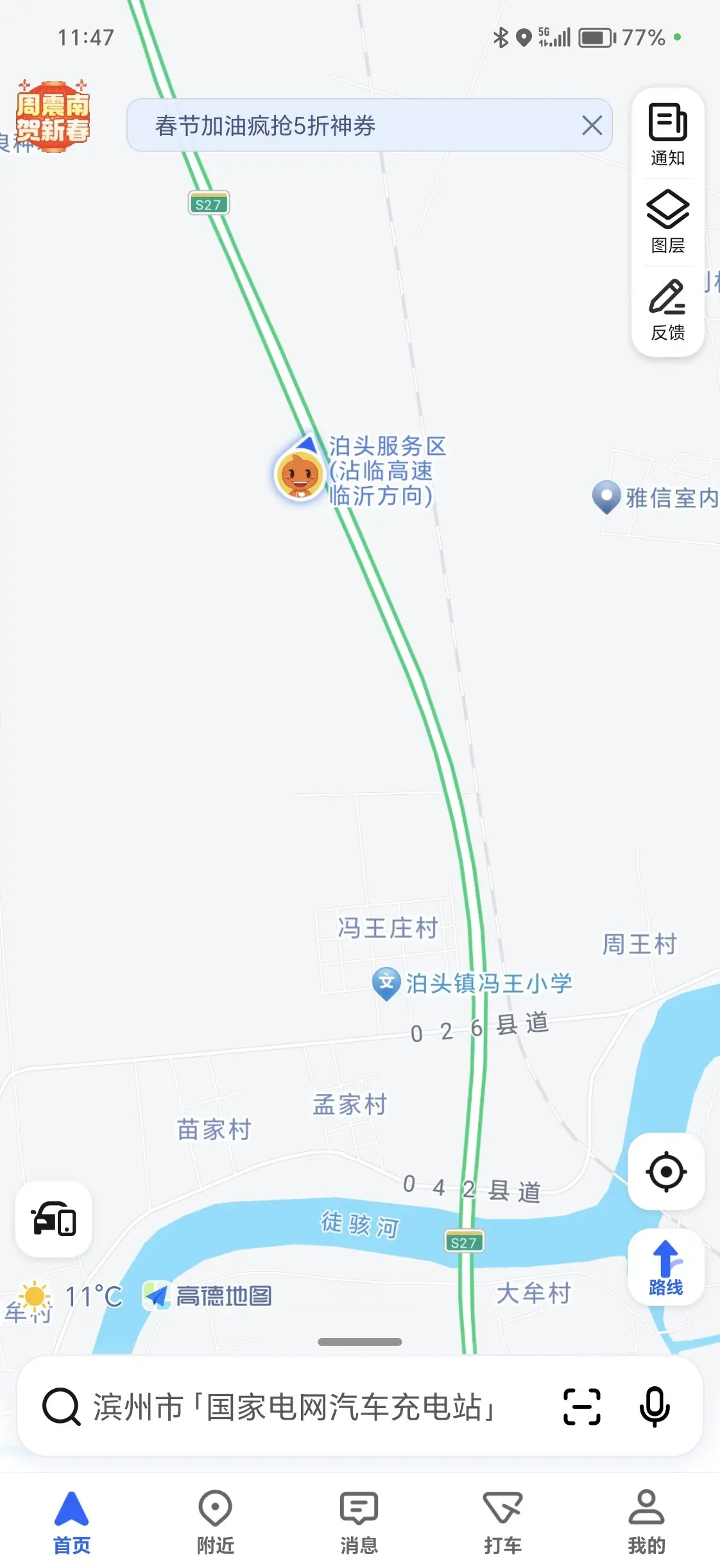 我们是大年初三早上8点出发的,车上两个大人,加一个小孩。行程总长度650公里。全程走高速,途经京津高速,荣乌高速,沾临高速,维荣高速。出发时wltp模式显示580公里续航。行驶车速130公里每小时。全程智能驾驶,只有在车多的时候自己控制一会,等车少了继续智能驾驶NGP。一路下来能耗基本保持在20千瓦,按照G6的电池大小87.5电,可以行驶400公里。当我们走到沾化服务区时,显示剩余公里数还有100公里,于是开始寻找服务区去充电,此时最近的服务区是沾临高速泊头服务区,当我们到达泊头时候表显剩余84公里,580-84=496,实际行驶了330公里。330/496=0.66。这样也就得出了跑高速打66折。泊头服务区不建议电车来充电,只有两个桩,而且充电速度最快只有60千瓦。可以去下一个服务区滨州东服务区有4个桩。沾临高速整体桩不是太多。这里给大家推荐一个小程序,山高供能。在这里可以看到山东高速服务区的桩数和使用情况。我们在泊头服务区充电充了一小时十分钟,充满电后继续前进。到家还有80公里。