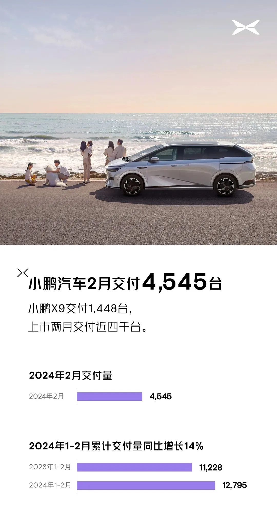 今日,小鹏汽车公布最新交付成绩。2024年2月,小鹏汽车共交付新车4,545台,其中小鹏X9交付1,448台,上市两月交付近四千台,持续领跑纯电MPV、纯电三排座车型市场。随着春节后的产能爬坡和个别供应链瓶颈的解决,3月起小鹏X9产能将会大幅提升,加速交付。