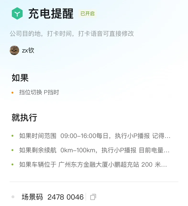 -在小区车库停车,且续航低于100时,小P提醒充电,且自动打开慢充口。