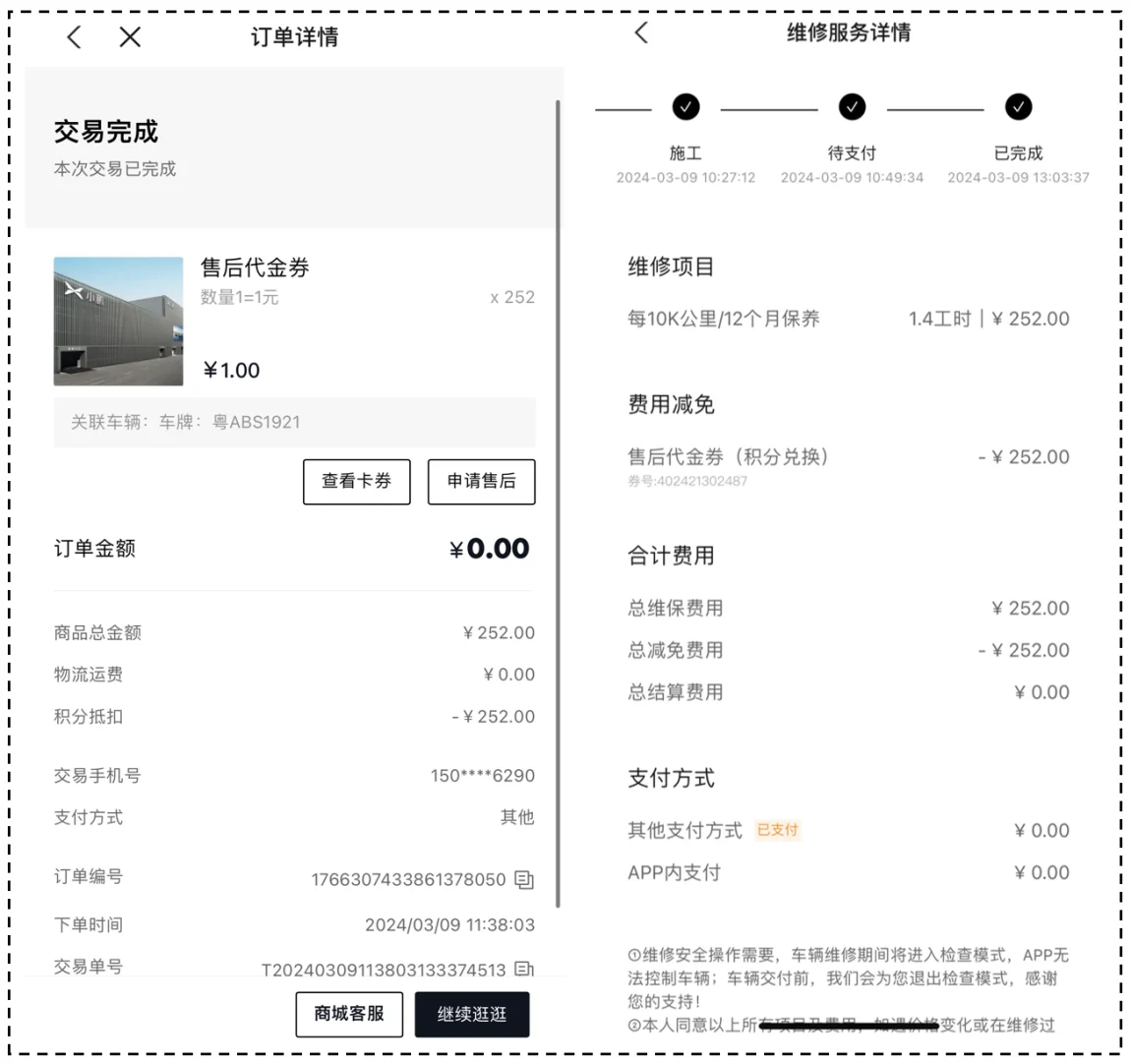 不知不觉一个多小时再吃吃喝喝玩玩的过程中过去了,售后小哥把我带到车辆附近并介绍本次保养的检查内容与结果,告知电池、刹车、雨刮、胎压等内容均无异常后顺利完成车钥匙再次交接,顺利完成本次保养,让我又可以继续安心用车。确认保养结果后便需要付款,售后小哥主动协助我使用积分抵扣保养费用,顺利完成了一趟又吃又玩又拿的0费用保养旅程。