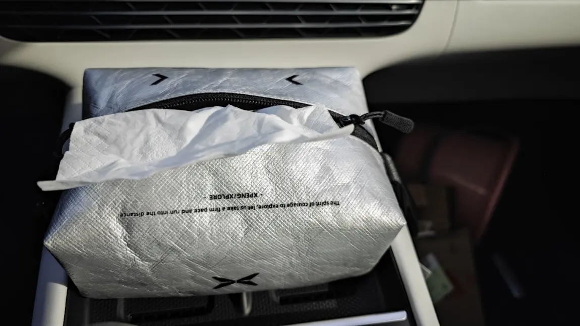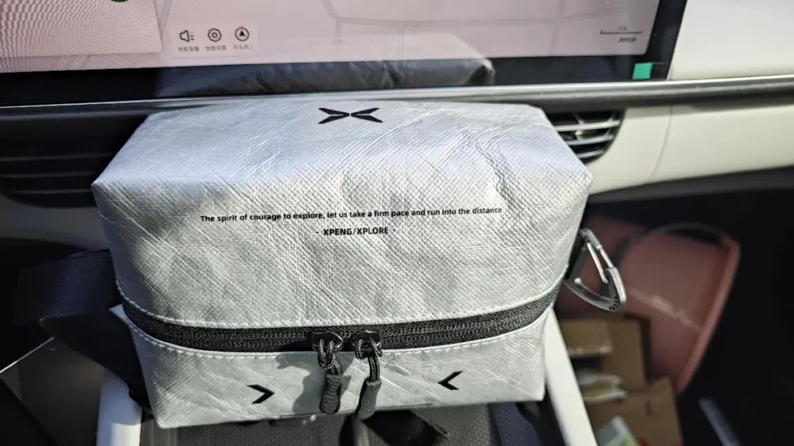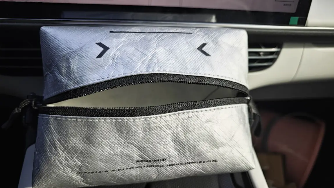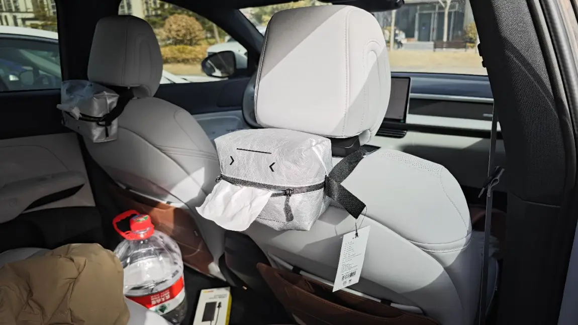 G6没有手套箱,少了一些储物空间,这款储物袋就很有必要了。向两侧对开的拉链,拉开抽纸盒般大小的储物空间,主要用途是放抽纸,放其他物品也是可以的。袋子一旁还有扣钩,可以挂一些雨伞等物品。整个袋子使用两段式的弹性绑带连接,绑带长度可以收放,中间有挂钩衔接。通过绑带挂在座椅头枕的下方,不影响座椅的使用。银色的外观加上可爱的图案,有些小可爱。比较实用,算不上精致。
