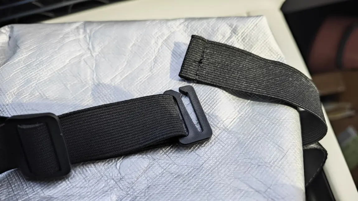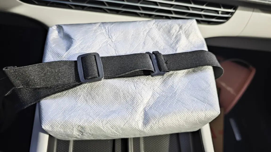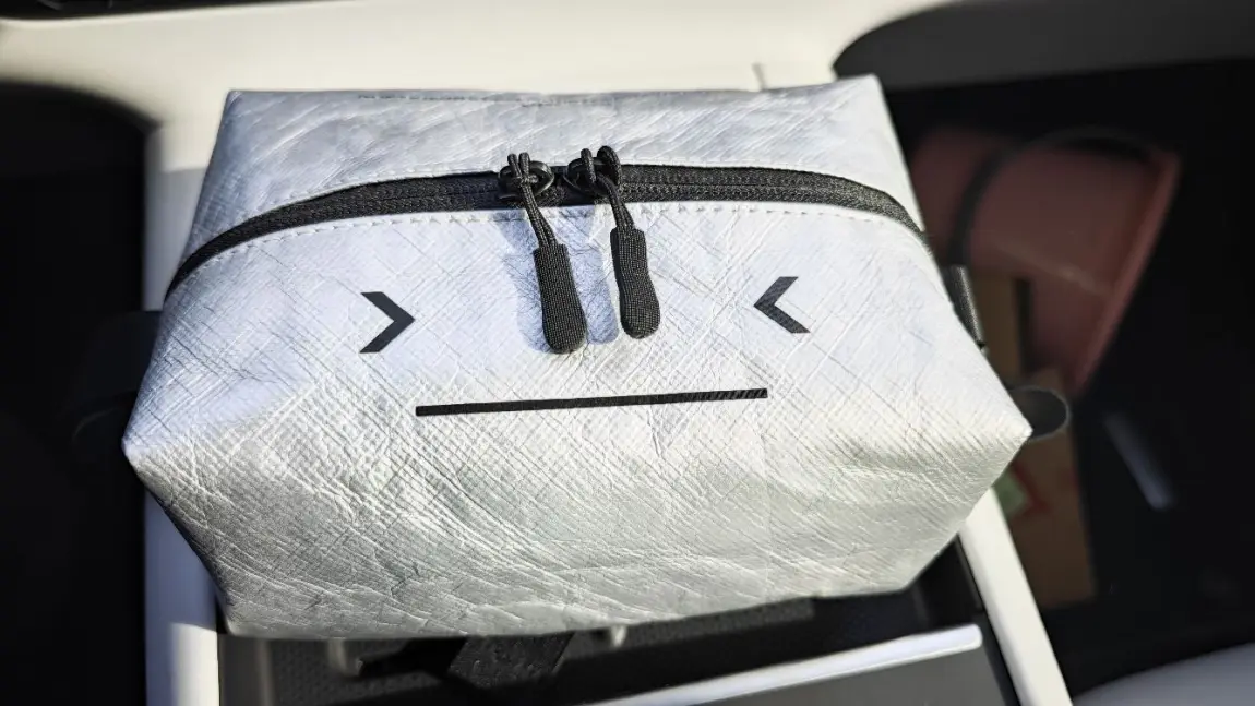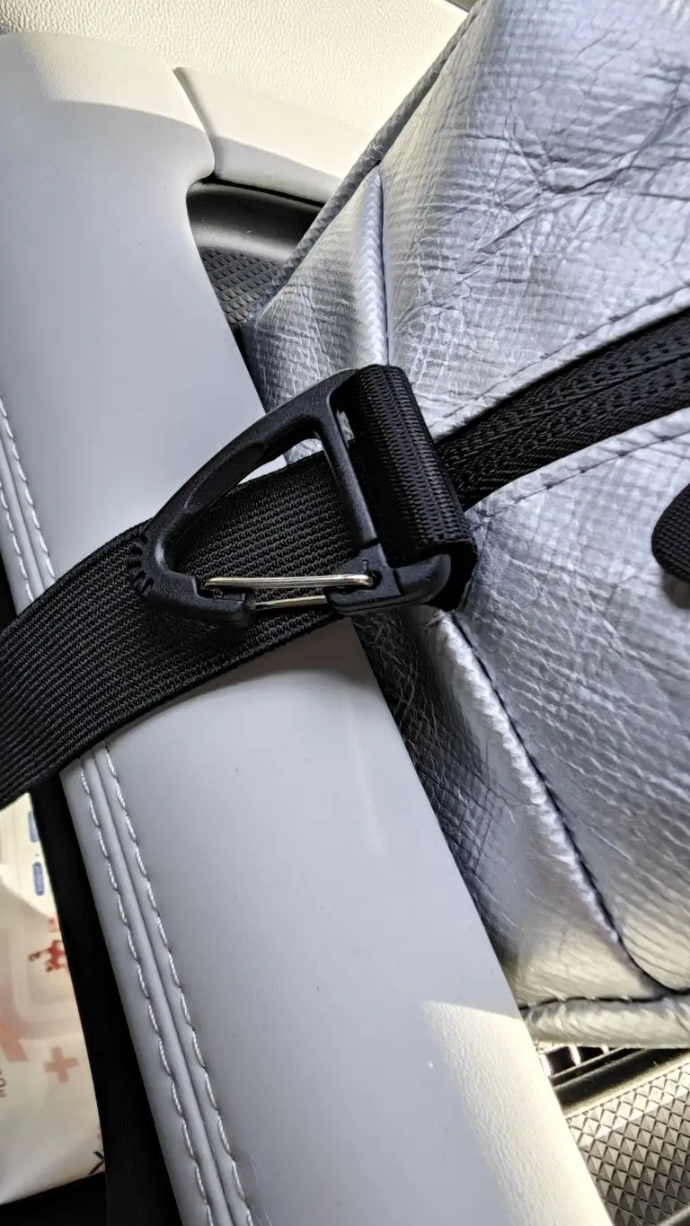 G6没有手套箱,少了一些储物空间,这款储物袋就很有必要了。向两侧对开的拉链,拉开抽纸盒般大小的储物空间,主要用途是放抽纸,放其他物品也是可以的。袋子一旁还有扣钩,可以挂一些雨伞等物品。整个袋子使用两段式的弹性绑带连接,绑带长度可以收放,中间有挂钩衔接。通过绑带挂在座椅头枕的下方,不影响座椅的使用。银色的外观加上可爱的图案,有些小可爱。比较实用,算不上精致。