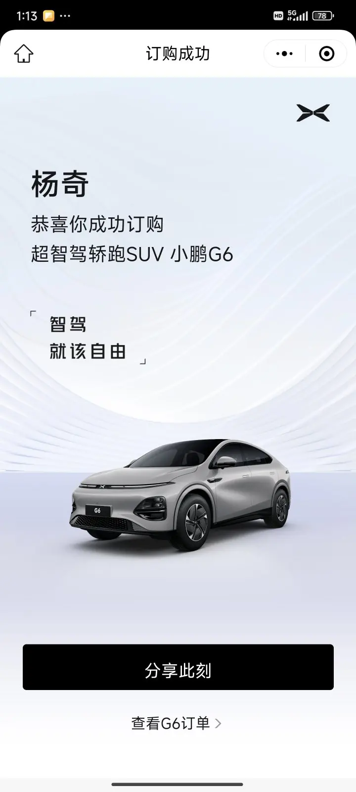 #我订车啦# 经过一段时间的考察和比较,我终于下定决心订购了小鹏 G6!当我签下订购合同的那一刻,内心的喜悦之情难以言表😄小鹏 G6 的智能科技让我眼前一亮,它不仅拥有时尚的外观,更具备强大的性能和舒适的驾驶体验。我相信,在未来的日子里,它将成为我生活和工作中不可或缺的伙伴🚗每次想到即将拥有自己的小鹏 G6,我都感到无比兴奋。它将带我去更远的地方,见证更多的美好。我期待着与它一起创造无数个难忘的瞬间,共同书写属于我们的故事🎈感谢小鹏汽车为我带来如此令人心动的产品,我已经迫不及待地想要开启这段全新的旅程了!