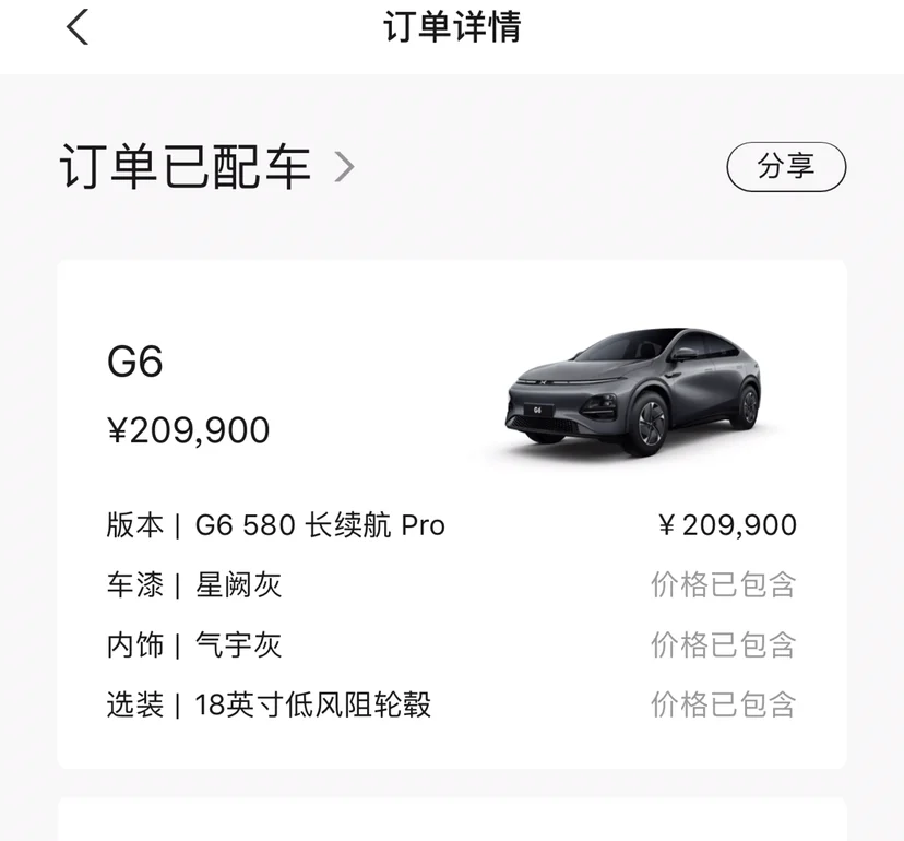 #我订车啦# 去年申请到一个电标,我其实是想买MPV,等来等去X9出来却不是很喜欢,主要是第二排航空座椅憋屈,对大个子不友好,不如活动扶手舒服,进出第三排也不方便,外观方面我不太喜欢侧面那道斜纹,加上车有点长,很多地方的车位停不下这个尺寸,媳妇开不了,所以只好放弃了。转过头来看G6,说实话,G6上市已经有一段时间,同等配置的新车很多,硬件方面竞争优势没那么大,但是呢,价格这不是也降下来了么,无论什么车,新上市难免有些小毛病,上市一段时间后,品控相对稳定一些,可能烦心事少一些。没选max是因为不放心高速迭代的自动驾驶,涉及安全问题,不能百分百信任那就还不如干脆不用,大部分时间在城区,用起来高度紧张,更累。没选755是因为虽然多175,但是三元建议充80%,磷酸铁可以100%,差距就会减少,里程的达成率又是七八折,差距进一步减少。家里可以安桩,平时市区都够用,没啥差别,开长途的话假设都选充电效率最快的阶段充电,也就是每次降到30%去充到80%,那么其实580也就比755提前60公里充电,一整天开五六百公里都是半路一次目的的晚上一次,似乎差别也不是太大。再开更远的路,或者堵车,低温等场景肯定还是大电池好,不过概率确实不大,也能主动避免一些。所以最终就580pro了。颜色是选耐脏色,北方这天气,脏太快,我是不怎么洗车,洗车靠下雨,所以银白灰就挺好。而且都里程焦虑了,浅色少吸热夏天还能稍微凉快点,轮毂18省电,也不用换。这么下来,就选了丐中丐。我预期他几年后冬天还能开300,夏天能400,就满意了。就现在这发展速度,可能用不了几年,就感觉不出来有什么区别了,正如iPhone6和6s,还有几个人知道区别在哪。有没有电车差别很大,什么配置差别就很小了,二手车市场那顶配也差不了几块钱。电车再次也能当大号充电宝,后排放倒凑合能睡,能外放电也拓展了很多应用场景。一切都会好起来的。
