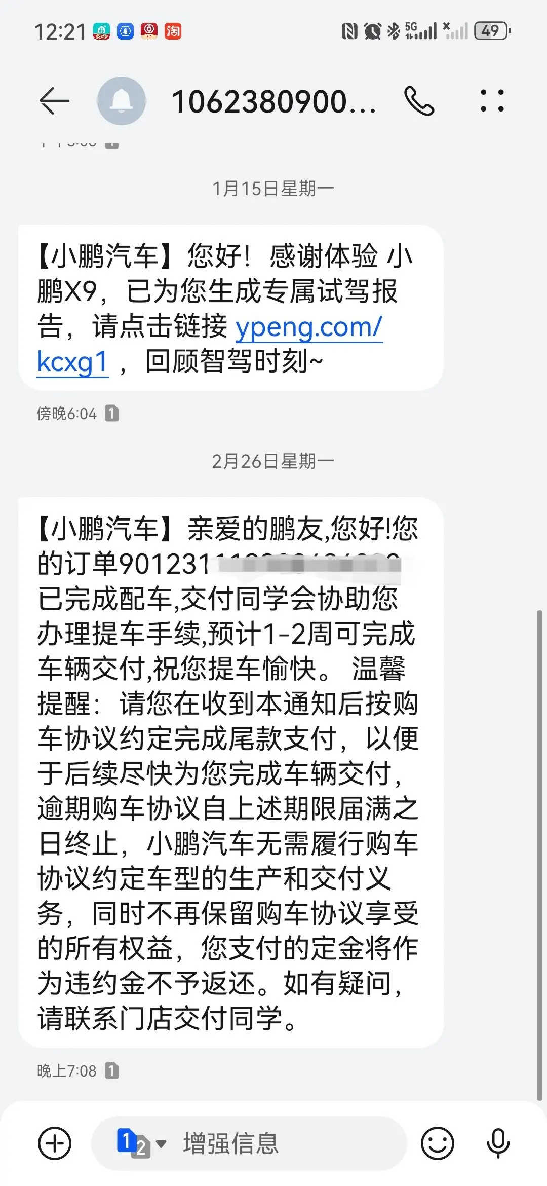 2月26日,周一,手机上收到一条短信:【小鹏汽车】亲爱的鹏友,您好!您的订单90213……哎哟我去,来了!
