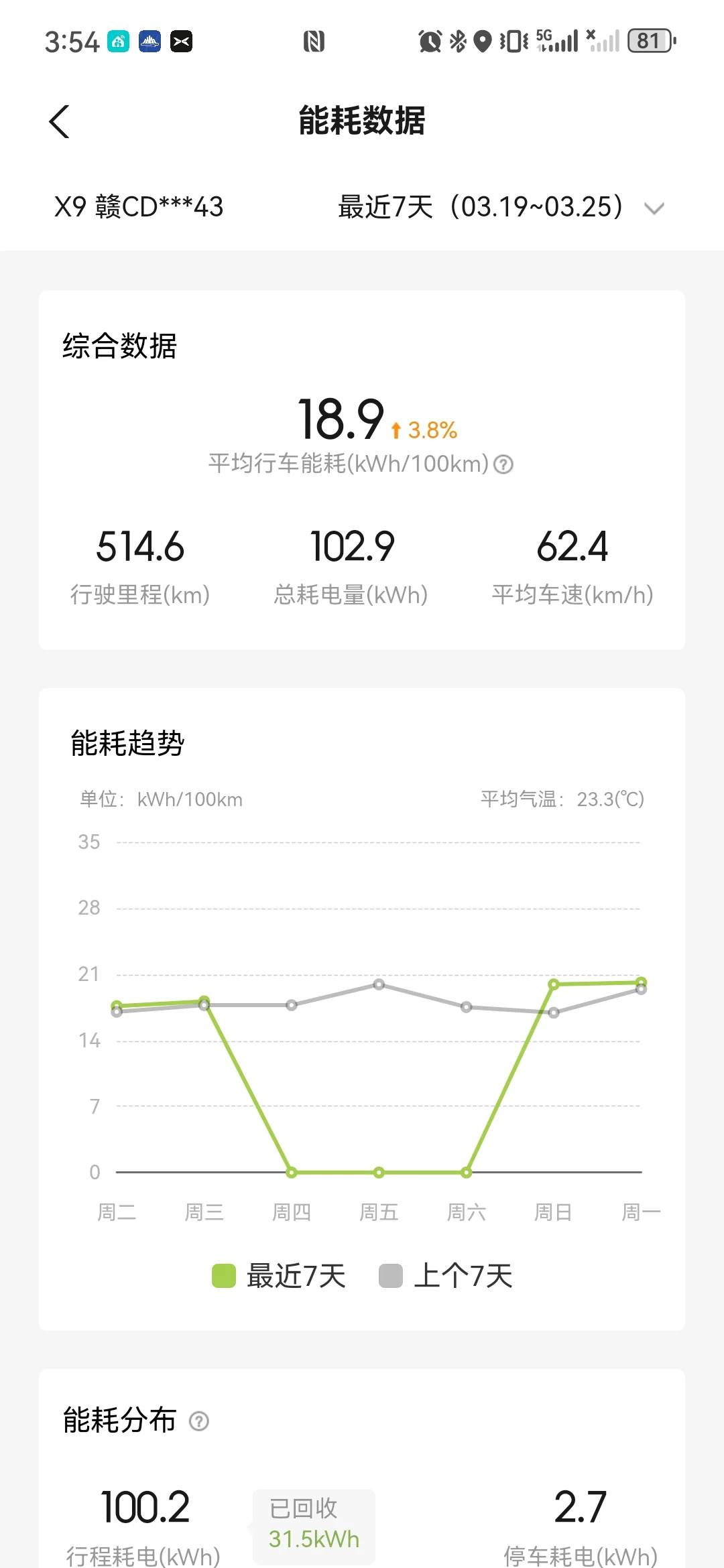 到目前为止,车提回家20天了,跑了1300多公里,总结一个字就是爽!首先是空间大,一家人出行非常惬意,特别是第二排,虽然没有选装零重力座椅,但带过道的座椅也很舒服,通风加热按摩都标配了,腿托升上来躺着也很舒服。后备箱由于是下沉的,空间也比较大,能装不少东西,最明显的就是我小女儿的推车可以不需要折叠就能直接装下,这点很赞。其次就是智能化配置很高,日常使用的功能调节基本上语音让小P操作就能完成。三块屏幕的分辨率都很高,我女儿现在坐车最大的乐趣就是要小P打开后排娱乐屏,然后看动画片。。为此我还特地买了个每月100G的套餐,这对我来说是刚需。。前几天上了高速,ngp确实好用,可以让开车的人轻松不少。目前感觉驾驶层面最实用的还是自动泊车,只要在能识别出车位的地方我都会使用这个功能,不得不承认停得比我这个十年老司机还标准。只是车子在车位识别上的要求比较高,比如侧方位停车的时候,如果前后车压线了就很难识别出来,只能靠手动停车了。这么大的车,手动停起来确实也有些难度。至于后轮转向就不再赘述了,指哪打哪,很轻盈。噪音方面,低速行驶基本感觉不到噪音,但时速超过100的时候胎噪和风噪确实会有一些,对我来说也还能接受,不是什么大问题。还有就是续航了,这段时间本地气温都超过了10度,高的时候有20多度,我用的是WLTP显示,满电495公里,实际开下来也差不多,最近7天能耗百公里18.9度电,对于一款这么大的车算是相当可以了。