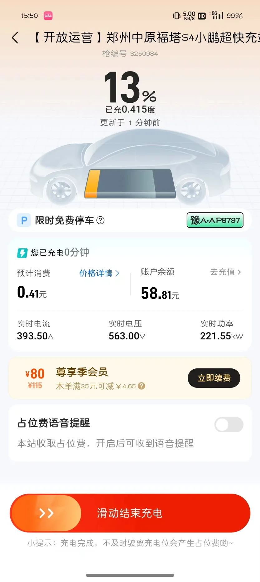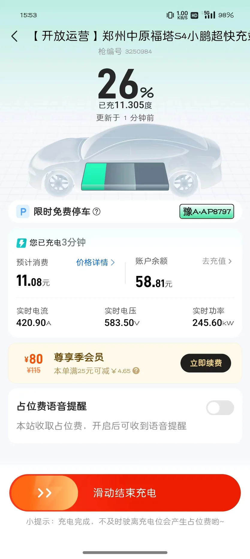 刚提车的时候,剩60公里,在S4超充桩上最大功率能跑到280kW。