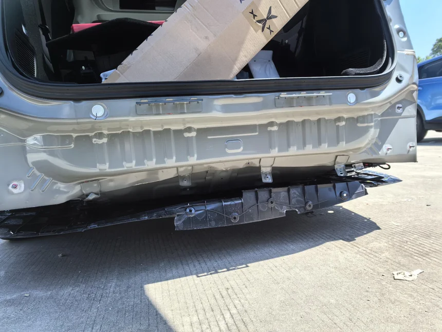 这个看起来没啥事 实际内伤严重 好吧 坐上板车拉去修咯 心态要好 但是我没想到一体压铸的 维修起来不要不要的啊!要切割后围板 后备箱槽 当我听到新车要变事故车 完犊子了要不卖了?不修了?