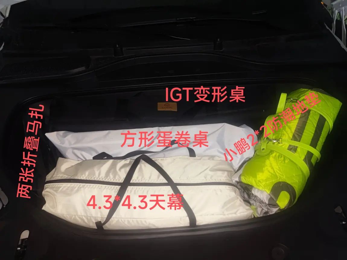 装备列表:4*4蝶形天幕,igt战术桌(配茶盘),方形蛋卷桌(麻将桌),4把月亮椅,2把马扎,小鹏防潮垫,聚拢露营车,折叠收纳箱(放厨具和零碎物品),备用小圆桌