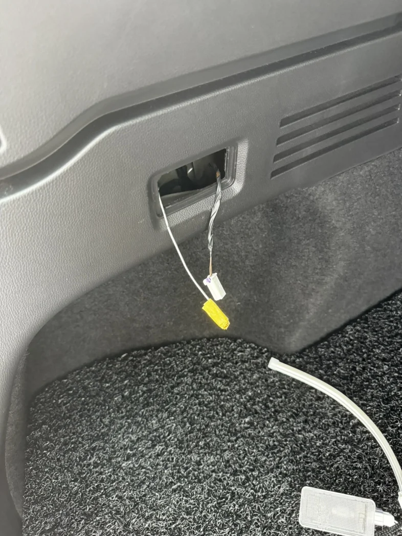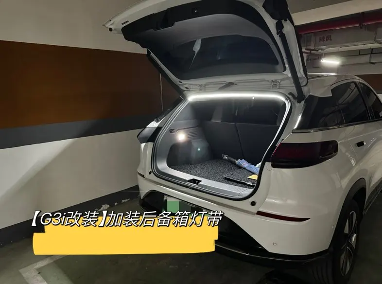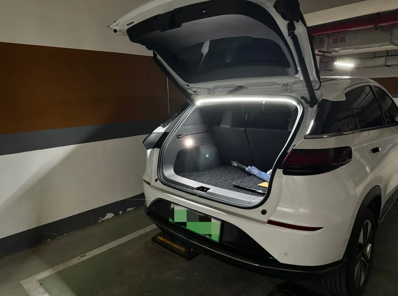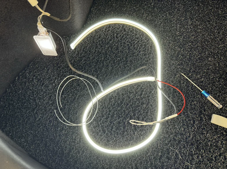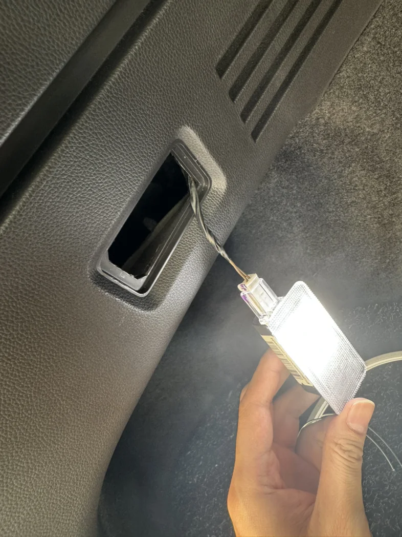 把线束对插上去,接上灯座和灯带,测试一下都能点亮,和后备箱开关完美联动,没有问题,灯带亮度和色温也特别好。