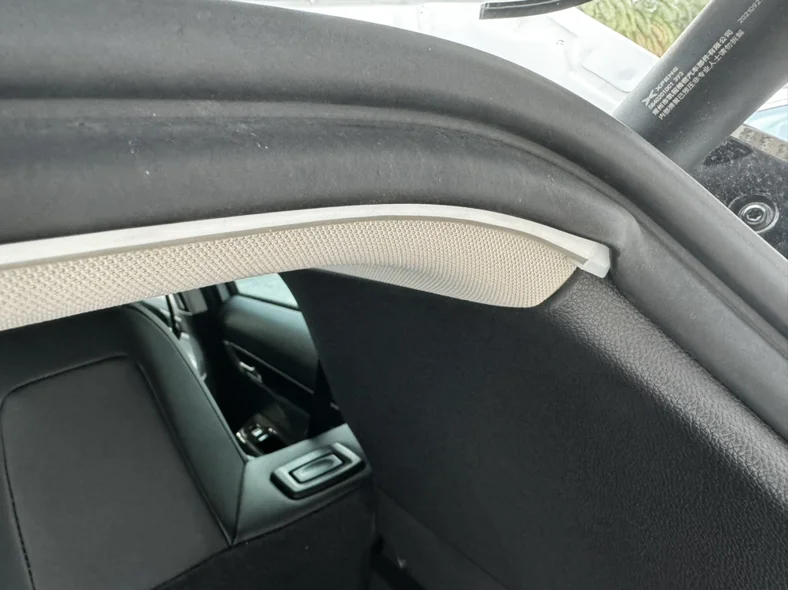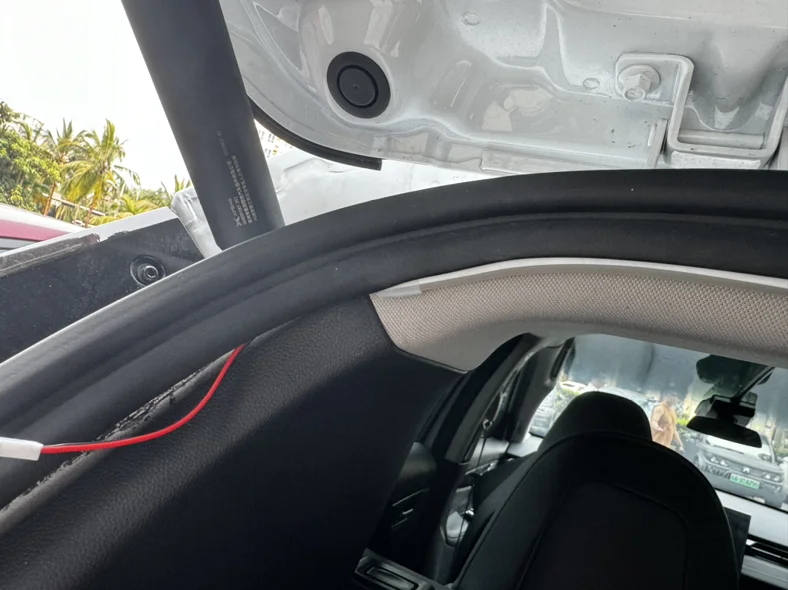然后是穿引线铁丝,我漏拍了一张扒开胶条的图,就是把门边密封条扒开一截,然后把铁丝从密封条那侧的缝隙顺进去,可以很容易的在灯座开口这边够到。这里面两个点要注意,一是给铁丝头贴上胶布包裹,不划伤里口,也不容易卡住,二是胶条掉的黑胶弄到手上要清理掉,否则白色灯带会染色。