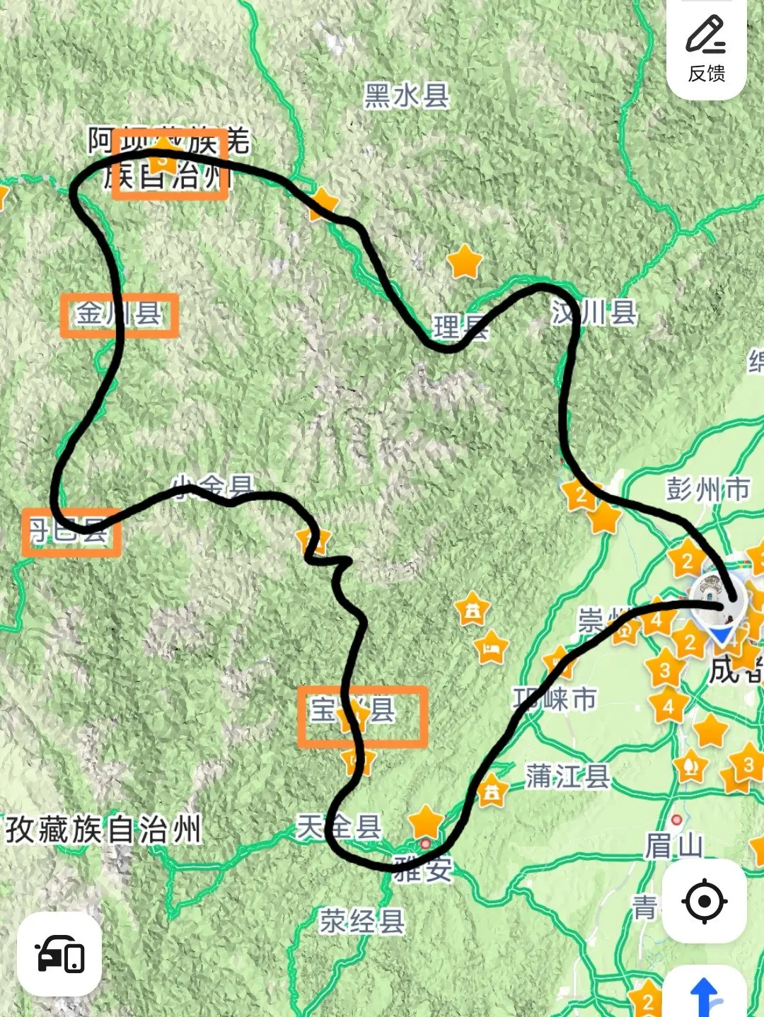 说具体的,两天两夜途径雅安宝兴,夹金山,小金,丹巴,金川,马尔康。