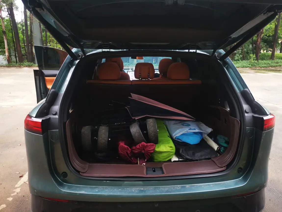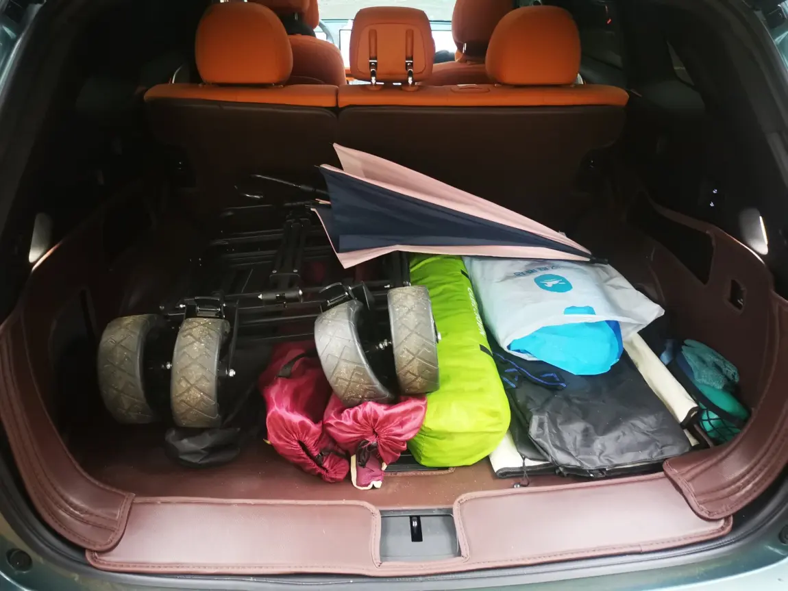 尾箱的空间真是大,平时我在车尾箱里放着露营的家当:拉车,户外桌子,椅子,地垫,雨衣什么的,平时装别的行李都不需要把东西搬下去。