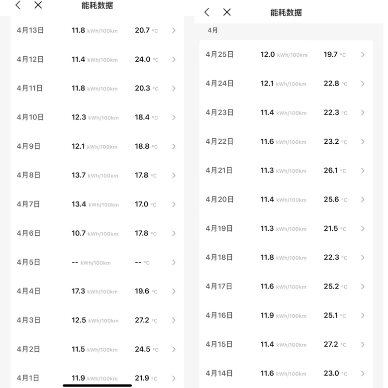 通过小鹏汽车APP查看能耗数据,自4月1日至4月25日,近一个月的时间里,咱小鹏P5的能耗表现相当稳定!近一周平均百公里能耗在11.6kwh。😱震惊❗感叹❗鹏厂不愧是臭搞技术的,在能耗把控上十分优秀!