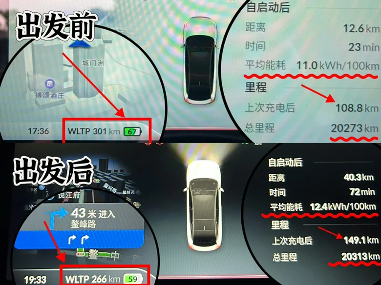 出发后(到达目的地): 表显总里程20313km,平均百公里能耗12.4kwh,同时续航剩余266km(电量剩余59%);