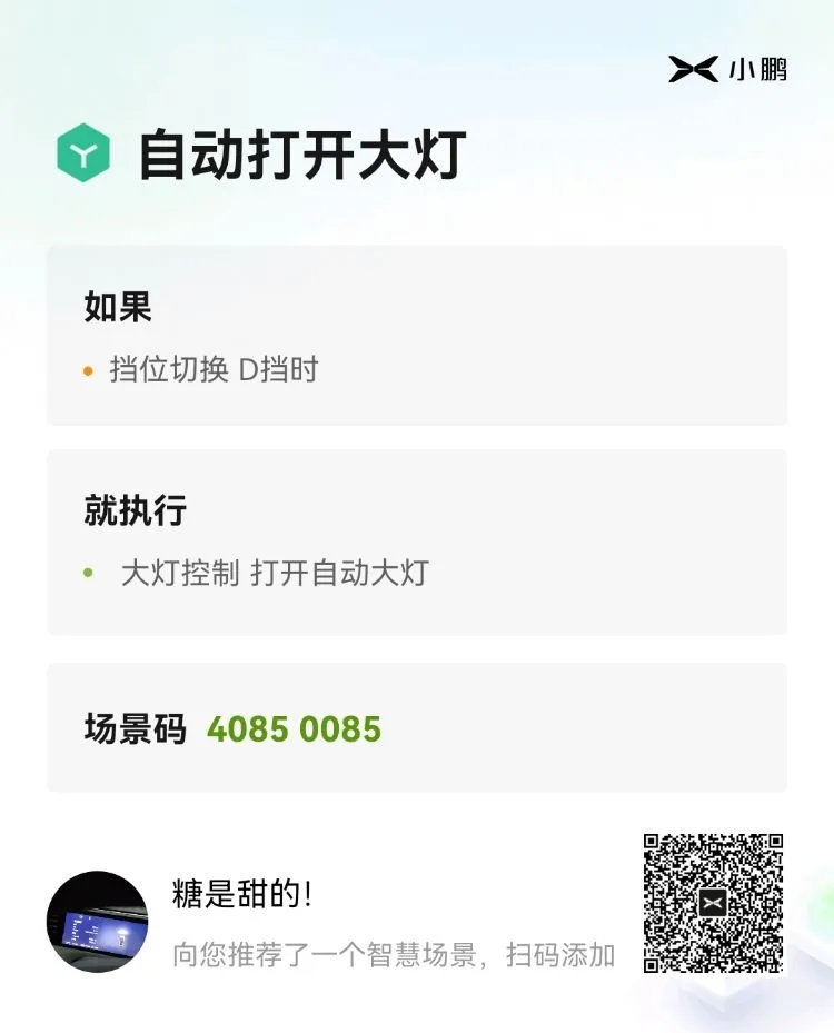 说明:在晚上关闭大灯时,只要把挡位切换到达D档或R档,大灯会自动打开。晚上临停时,有些鹏友喜欢叫小P把大灯关闭了,但开车时却忘了把大灯打开,这样行驶不安全。此场景自动打开大灯,大大提高行驶安全。