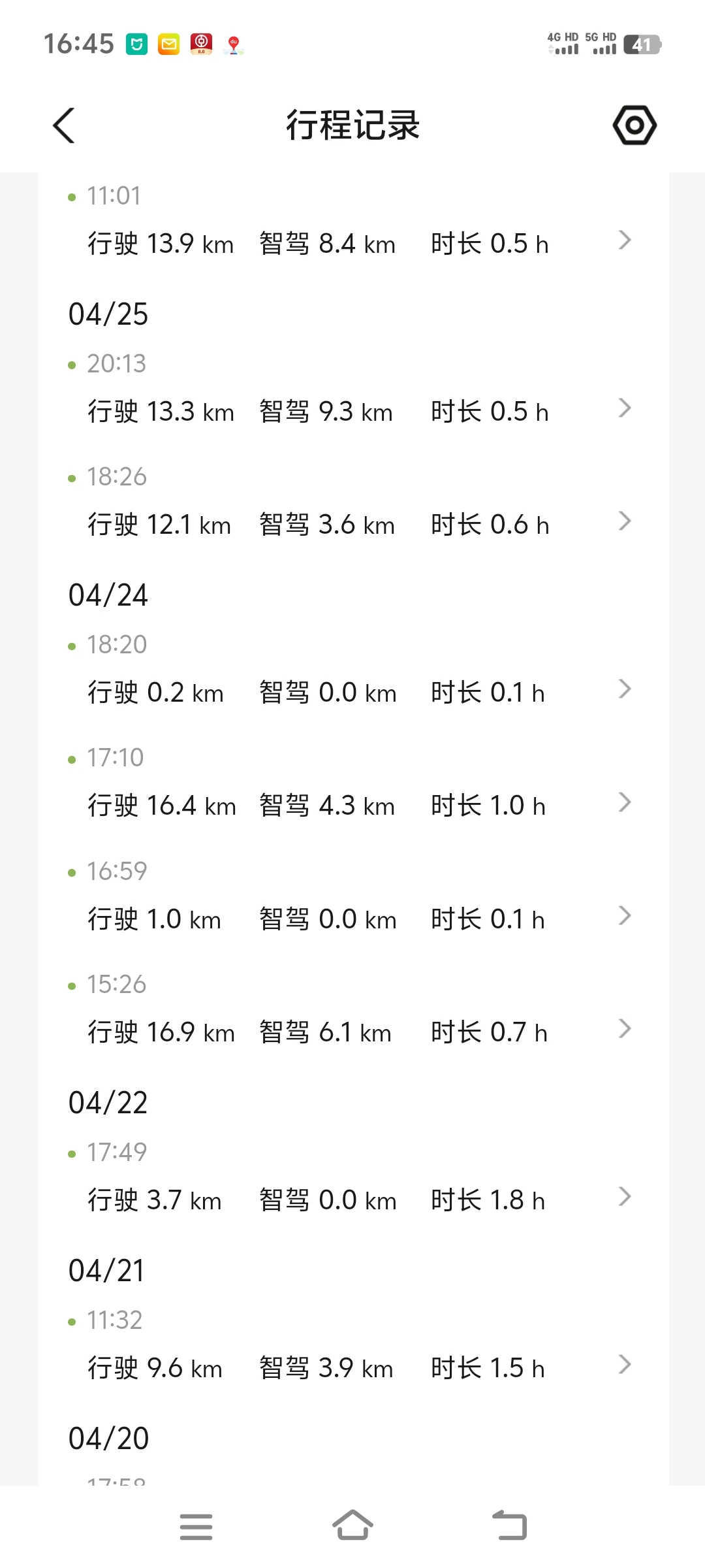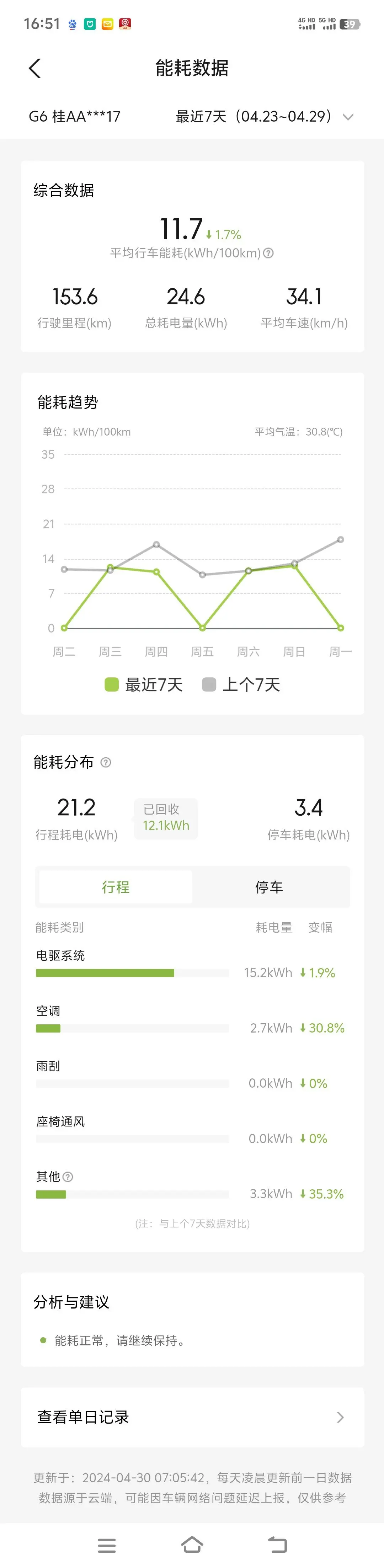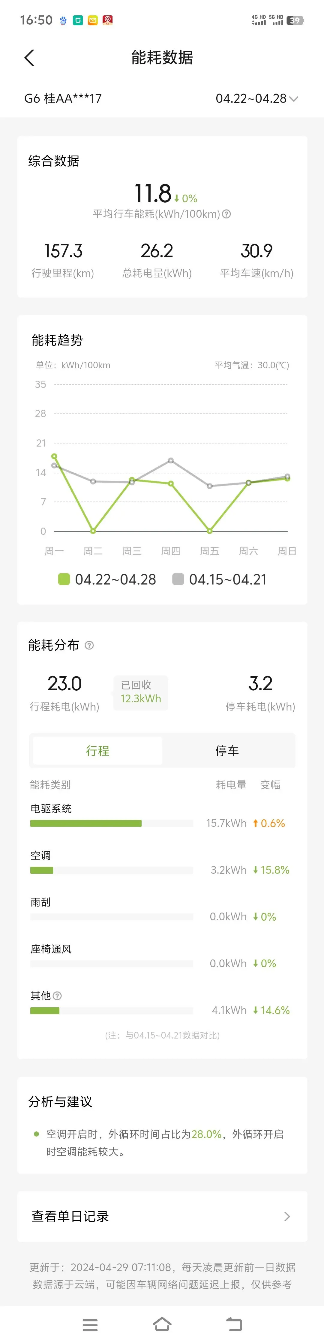 我最近一次充电是4月16日,当时我是在小鹏自营充电桩充到90%左右,然后去单位充电桩慢充到100%——之所以这样做,还是那个购买G9的同事建议的,他说磷酸铁锂电池快慢充交替(快充80%慢充20%)会使得电池续航达到最大,同时也会让电池更耐用。实际上是不是这样我先不置可否,总之这次统计“起点”就是4月16日,而统计“终点”就是4月28日我再次去充电,当时续航里程还剩下111公里。