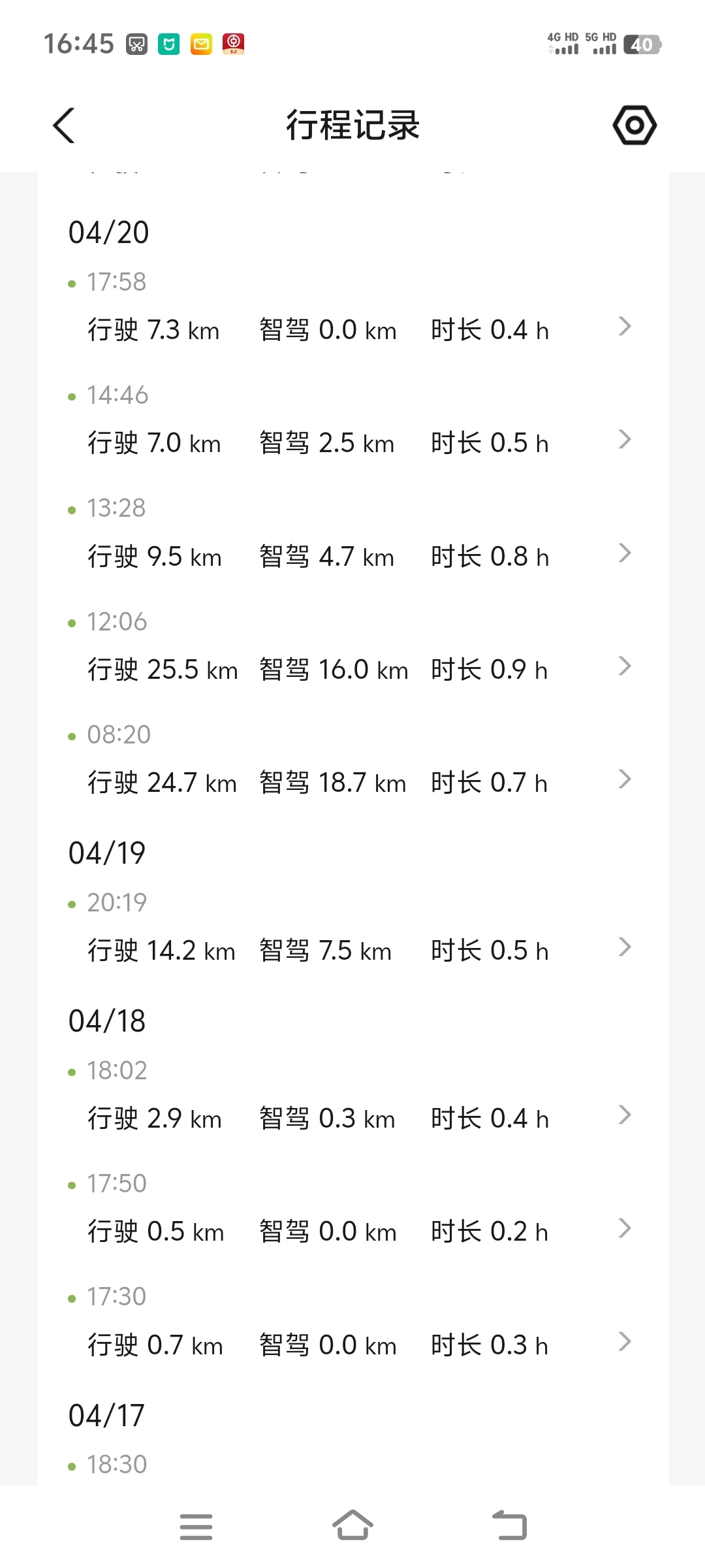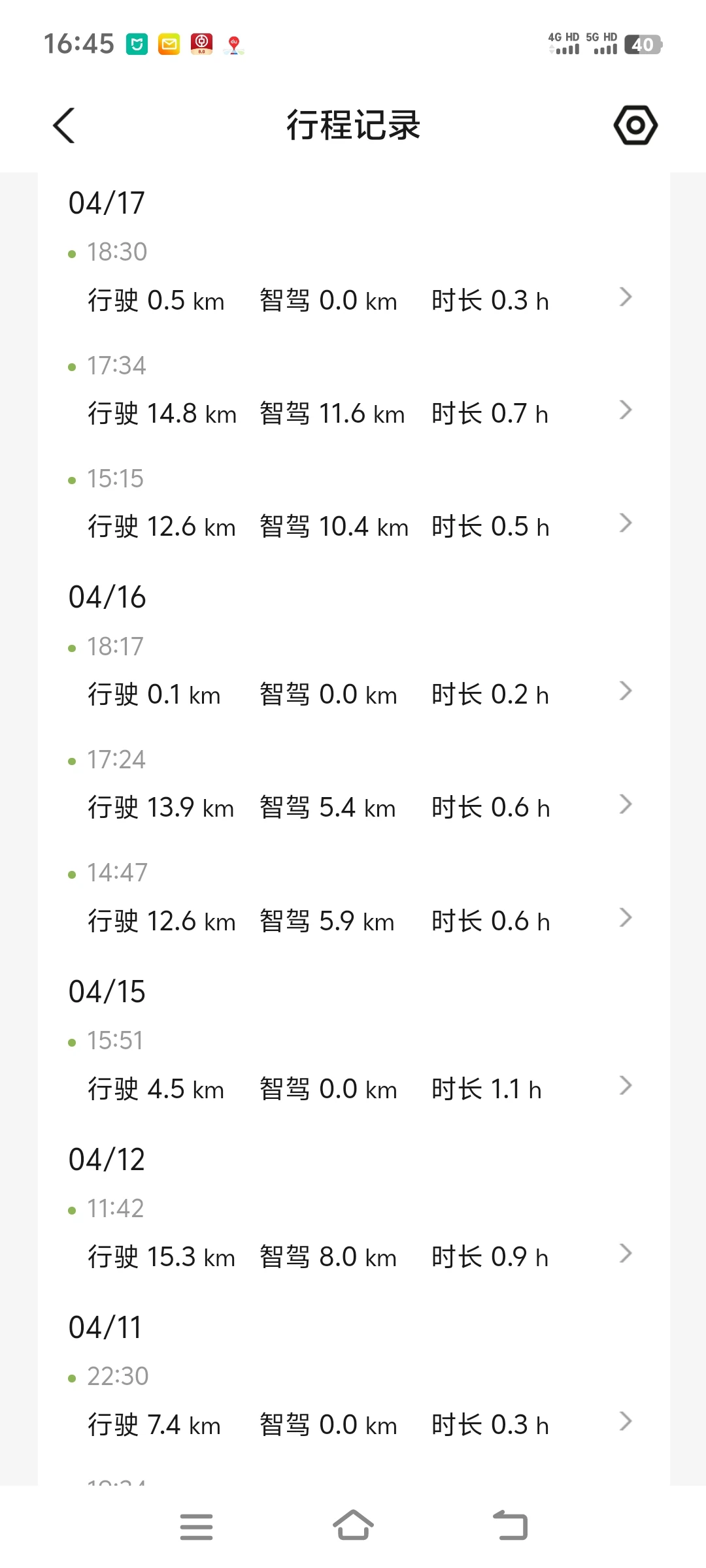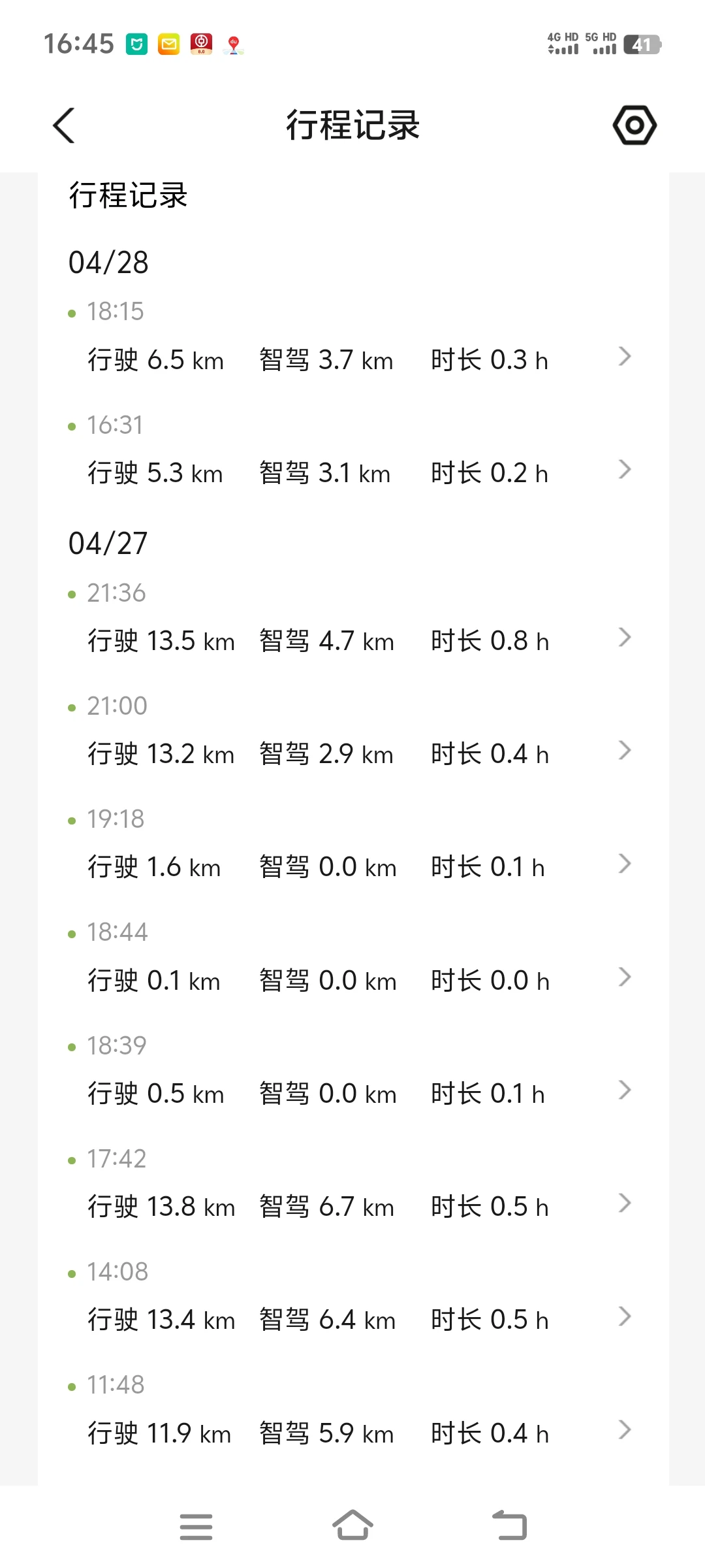我最近一次充电是4月16日,当时我是在小鹏自营充电桩充到90%左右,然后去单位充电桩慢充到100%——之所以这样做,还是那个购买G9的同事建议的,他说磷酸铁锂电池快慢充交替(快充80%慢充20%)会使得电池续航达到最大,同时也会让电池更耐用。实际上是不是这样我先不置可否,总之这次统计“起点”就是4月16日,而统计“终点”就是4月28日我再次去充电,当时续航里程还剩下111公里。