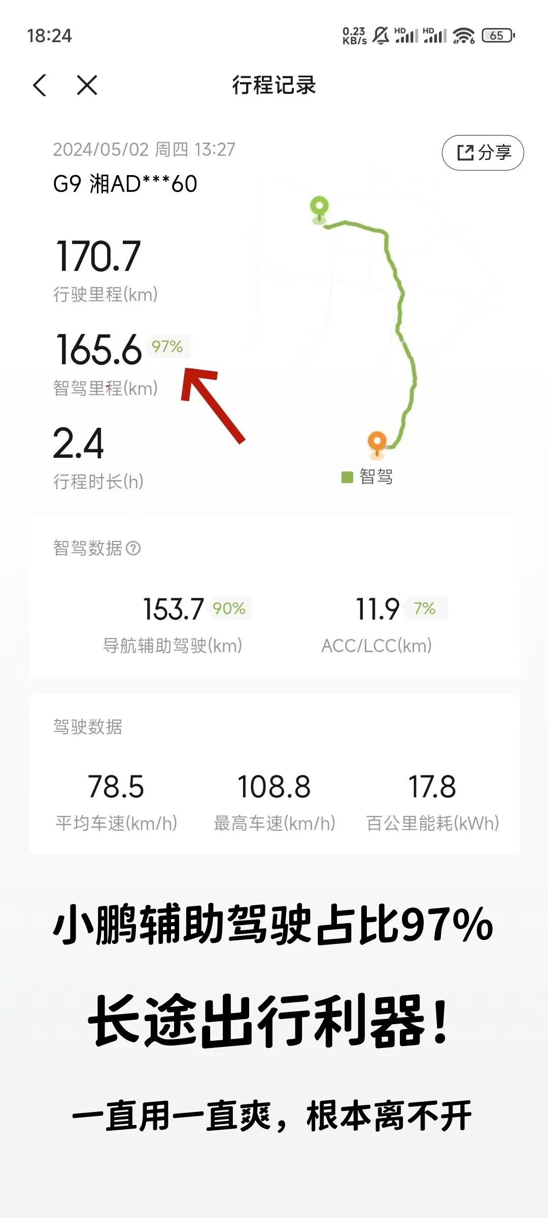 170KM的路程,小鹏的辅助驾驶就占到了97%,自从用过之后,真有点过度依赖了,根本离不开,只要路况合适就会开启!