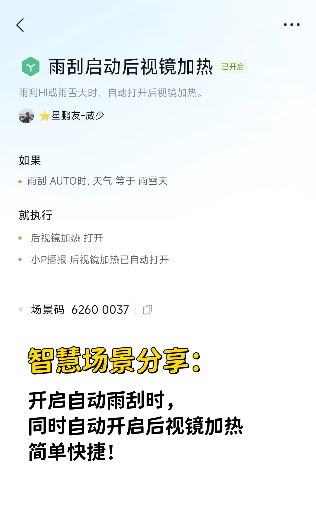 这次旅途,天空一直下着小雨,后视镜和后档一直都会挂上水珠,非常影响视线,大家可以尝试添加小鹏开雨刮自动开启后视镜加热的智慧场景。