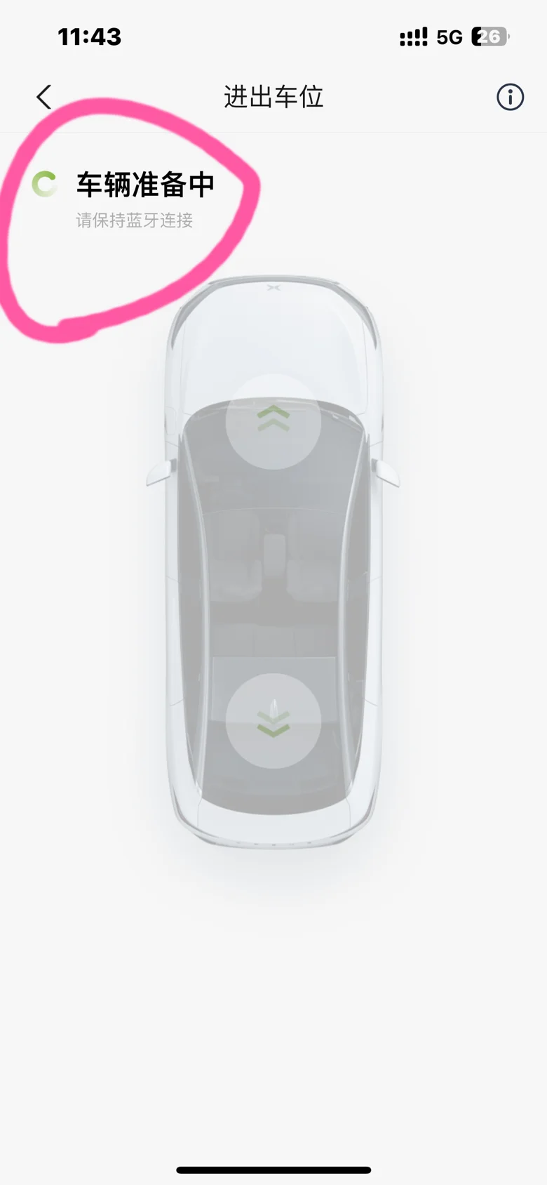2️⃣点击“进出车位”,就会打开显示了咱小鹏P5车辆轮廓阴影状态,页面左上角显示“车辆准备中”,请保持蓝牙连接。