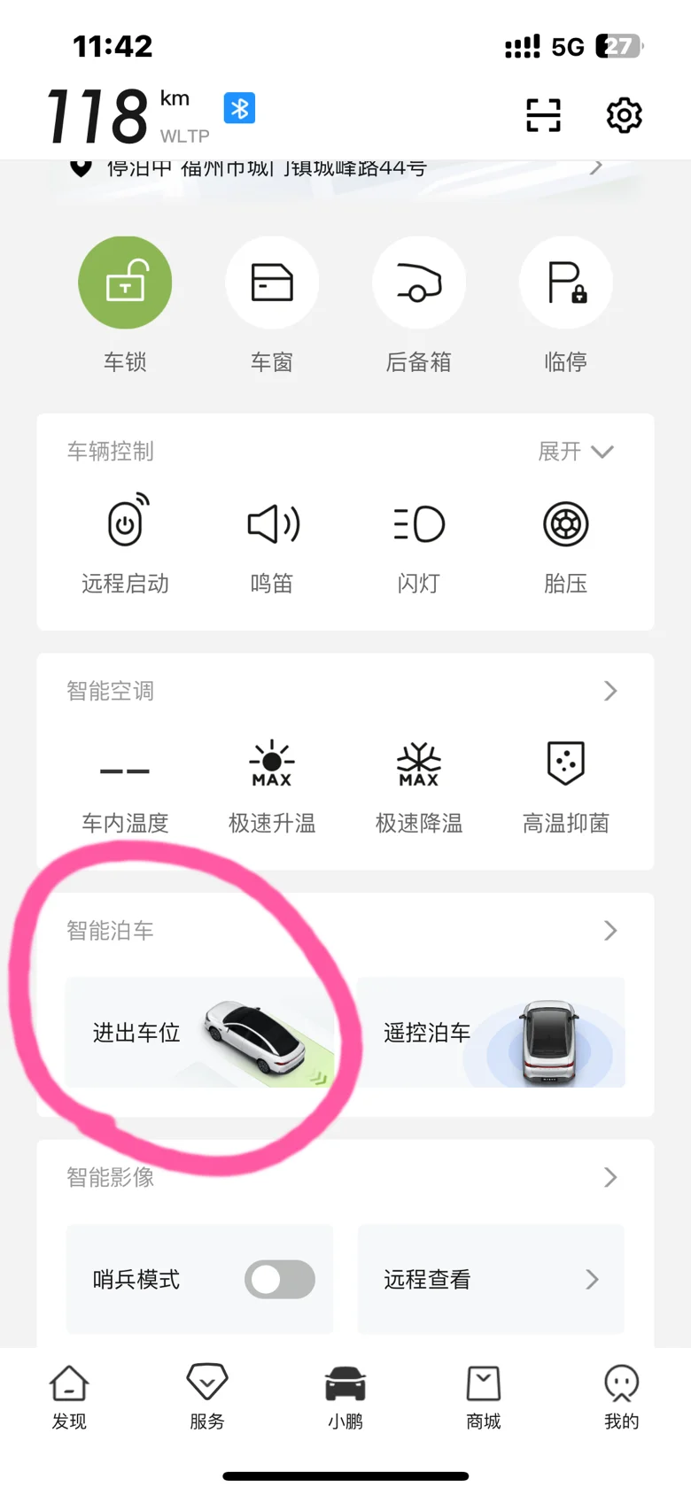 1️⃣首先,在小鹏汽车APP里 打卡“小鹏”主板块,该板块可以看到剩余续航里程,车辆控制、智能空调、还有智能泊车、智能影像。其中找到智能泊车里的“进出车位”;