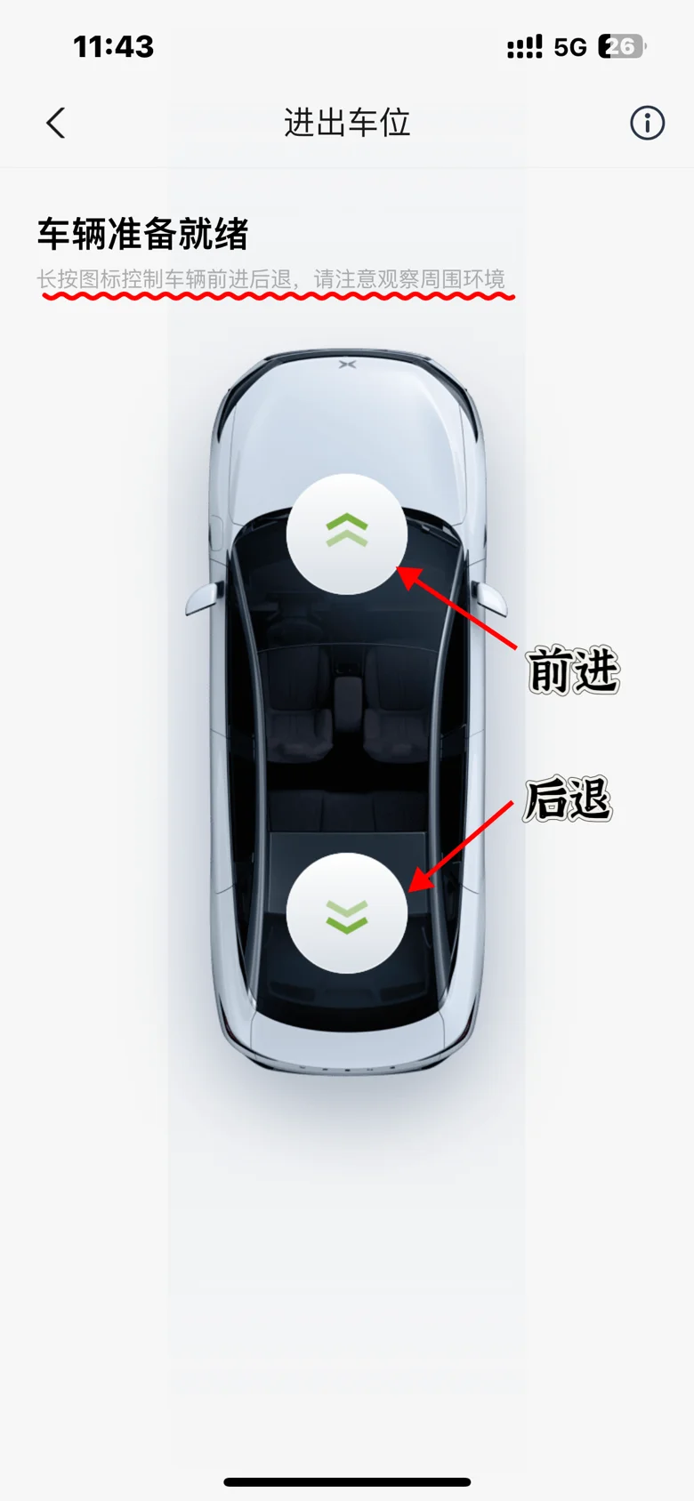 3️⃣“车辆准备就绪”后,根据页面上的🩷温馨提示:长按图标控制车辆前进后退,请注意观察周围环境。此时,我们就可以根据页面上下两个按键,轻松控制车辆的前进与后退了!