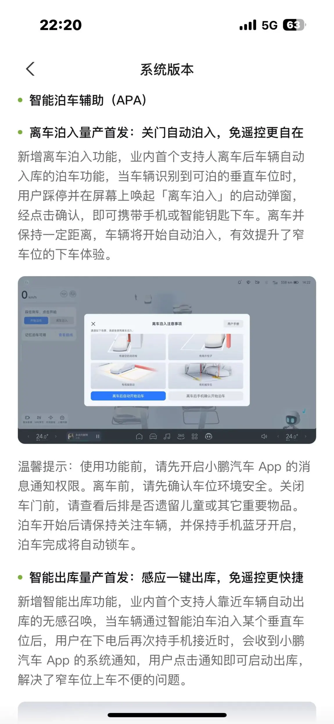 再就是新上的离车泊入功能,想象一下以后带朋友们出去玩,潇洒下车,鸡柳自己泊车,想想就是很给自己张面子的事情,突然很期待约一波朋友展现一下我的钢铁侠了,哈哈,明天抓紧练练,早日给我的小鹏涨涨脸!!!