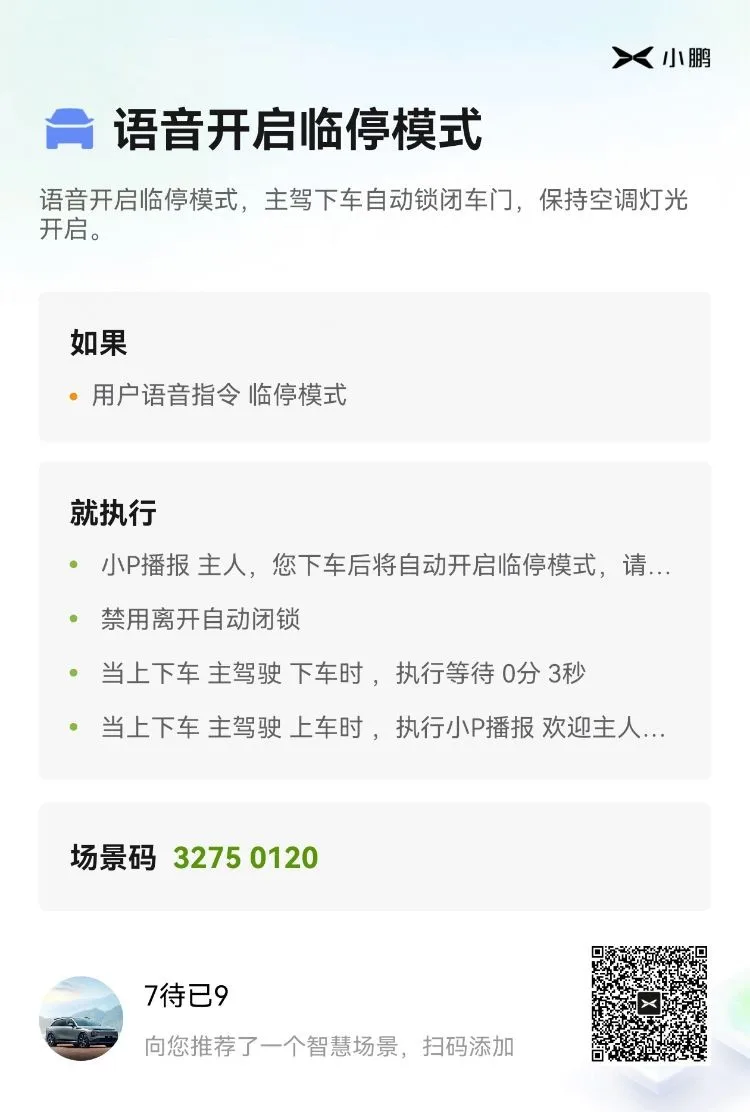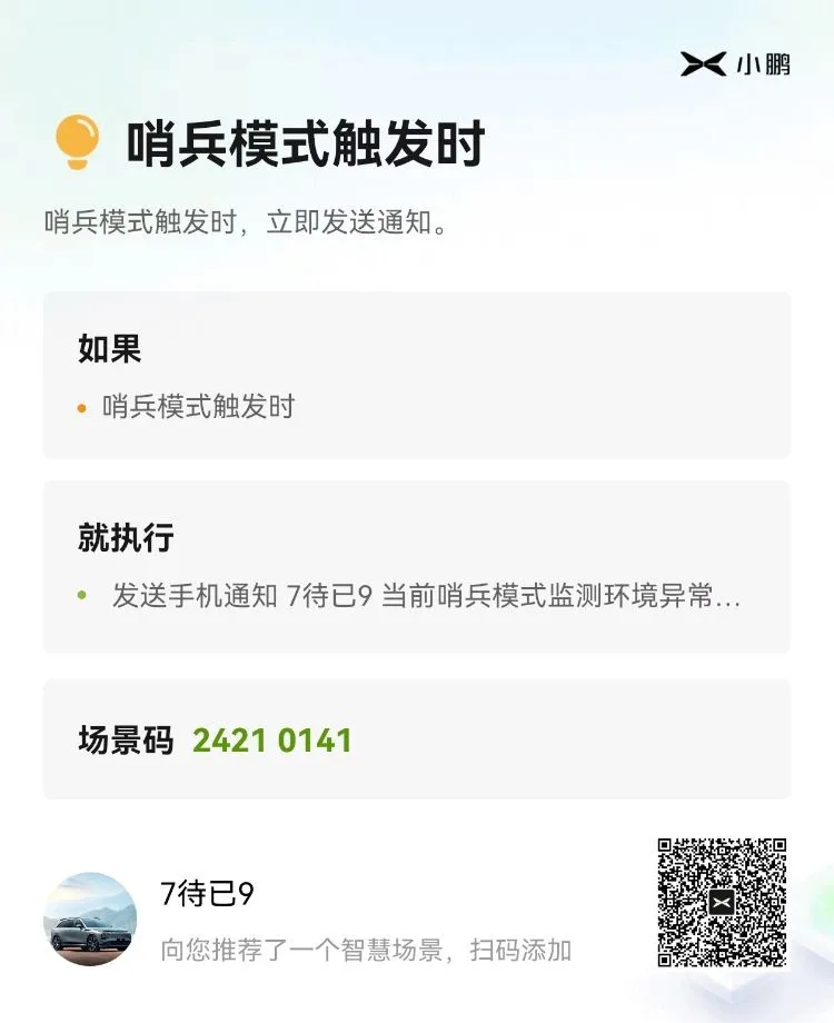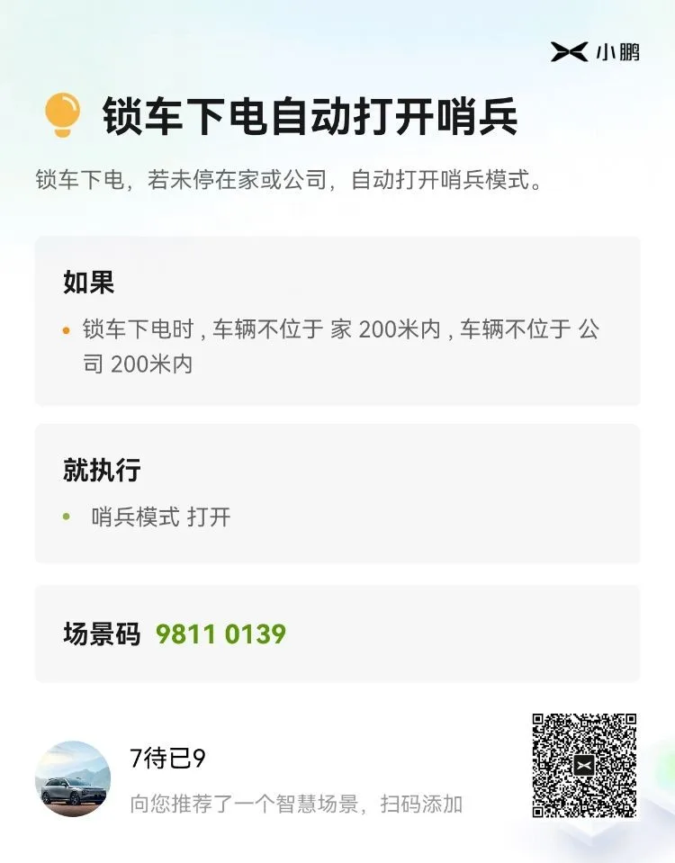 智慧设置了锁车自动开启哨兵模式,这样不用每次掏出手机在APP上点了。(我因停在家和公司比较安全,所以在场景里设置了这两个地方不开启)