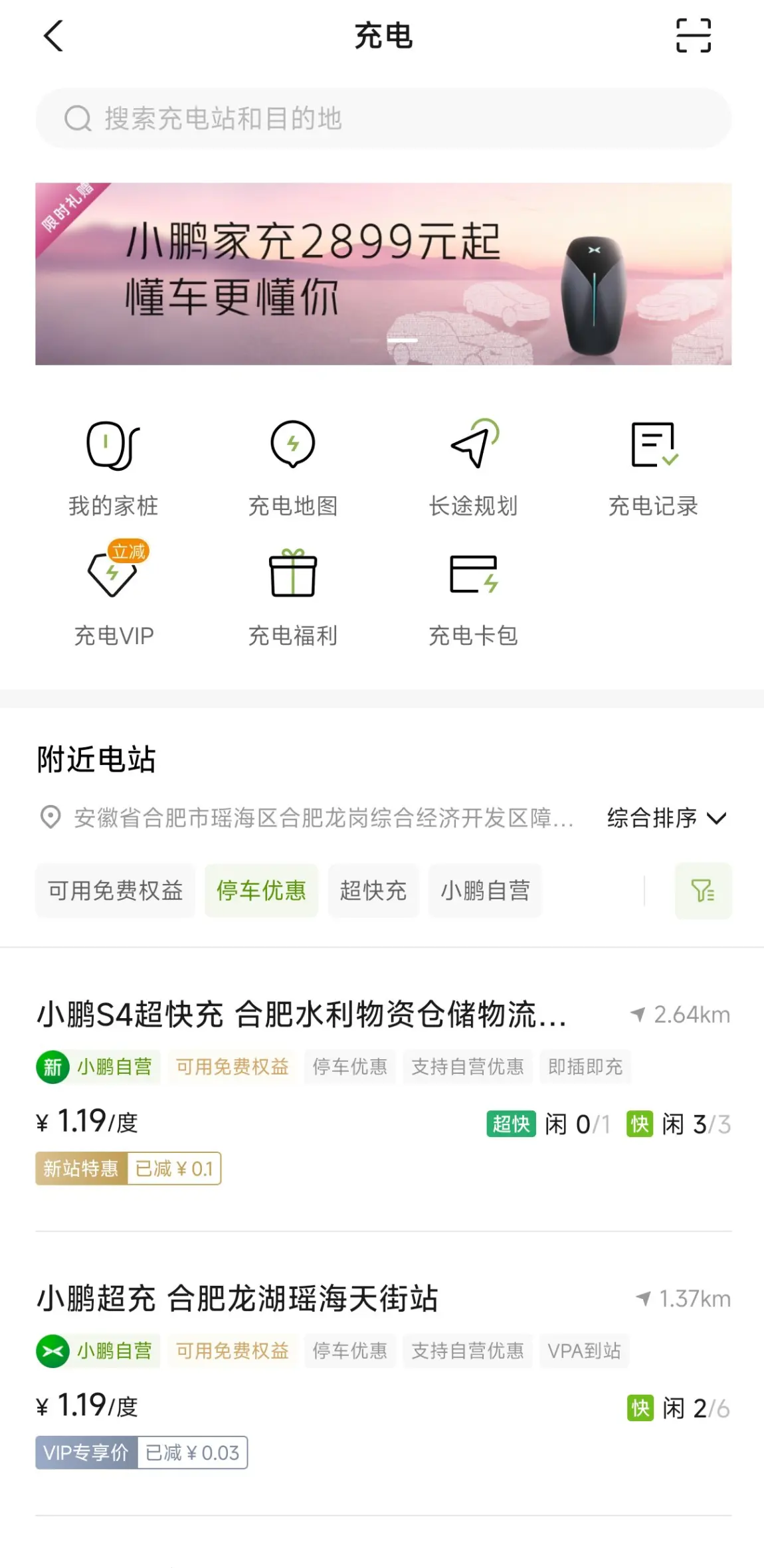 打开小鹏app,找到充电中心,这时候就会自动显示附近的充电站。可以根据自己需要,点击筛选标签,快速筛查满足条件的充电站,如停车优惠、超快充等。然后通过综合排序,挑选距离最近的充电站。