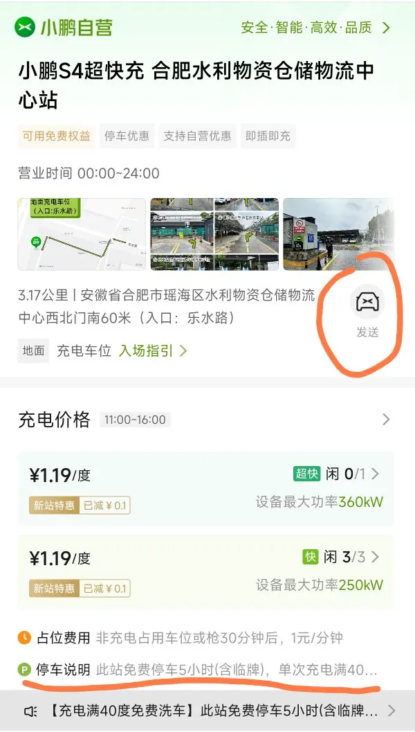 选择好一个站点,点击进入,可以了解更多站点详情。觉得满足自己的需求,可以在位置旁边点击发送即可瞬间同步到车机大屏,一键导航,特别方便。