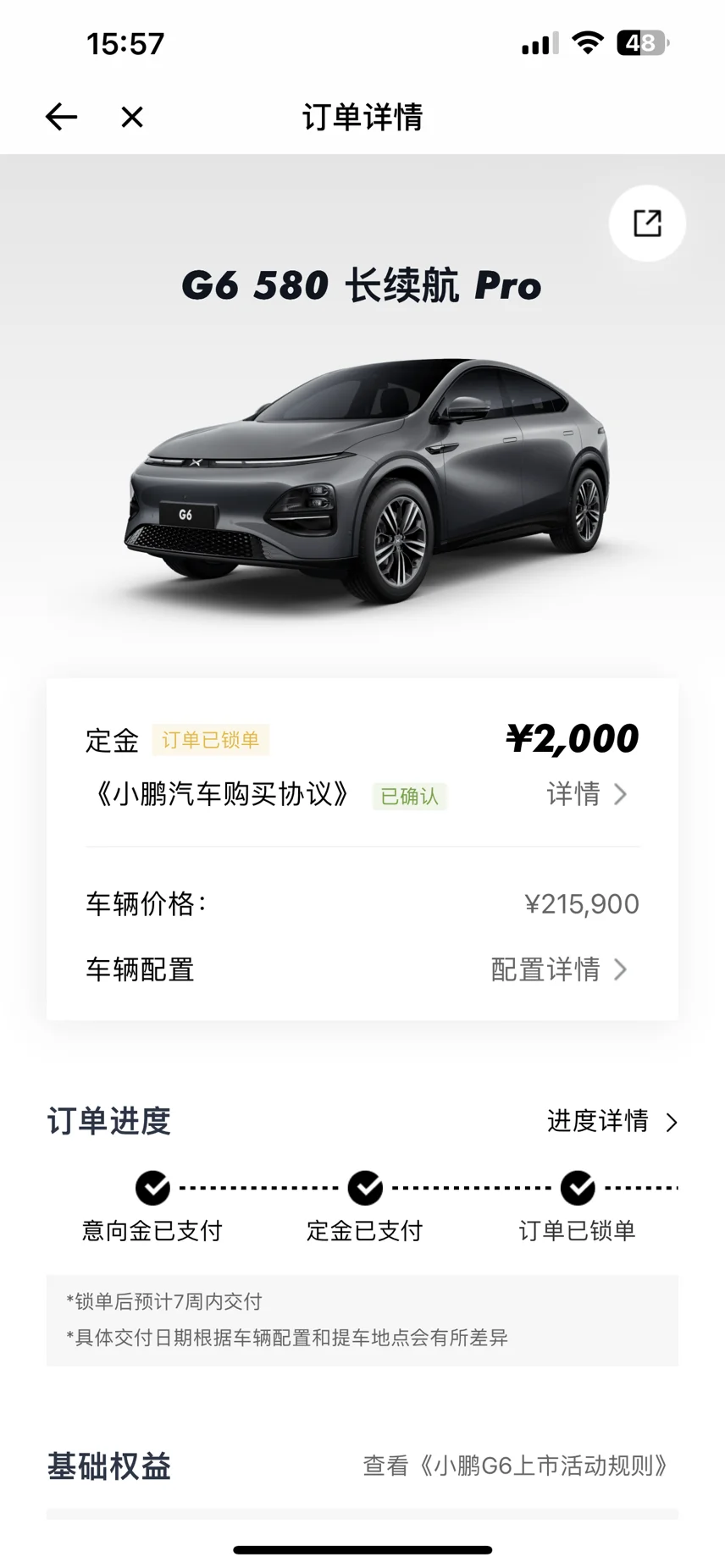 了解到小鹏G6会在6月29日上市,于是在28日赶紧盲订下来,29日晚上全程看完大师兄的发布会,第二天就开始准备约销售试驾,后面由于工作原因拖到7月才试驾到G6。后面又拉着家人去试乘加试驾,家人当时对G6的大空间完全满意,白内饰和灰色外观都很喜欢,于是转大订开始了等车之旅。