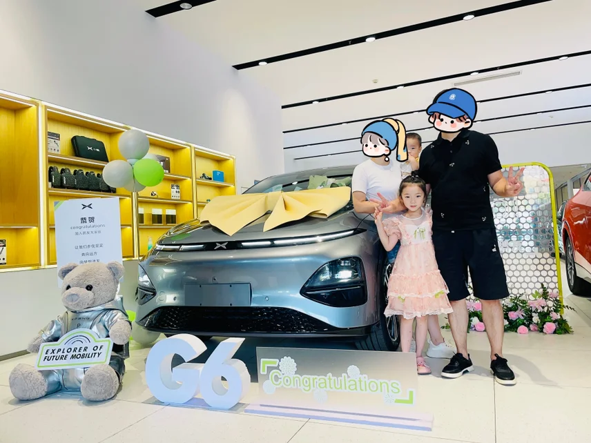 在小鹏销售和交付的不懈努力下,8月我们的G6终于到店啦,交付提前跟我约好时间交代提车注意事项,工作真的很细致。于是在8月10日,带着老婆和两个宝宝去交付中心提车了,因为去的很早,交付还贴心的让我们先去食堂吃完早餐再准备提车车。待我们来到交付区,亮晶晶的G6再那里等着我们,真的好帅气。在交付的配合下,1个小时就完成了提车手续和临牌,效率真的高,给我的交付点赞。因为是盲订客户,还有礼盒和林志颖签名小熊,刚好两宝一人一个。