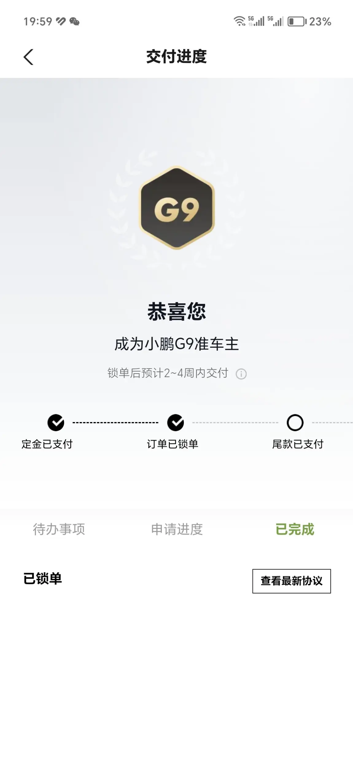 如果你是选择新车的话那么这个阶段就是小鹏工厂在为你疯狂打螺丝生产呢。如果是现车估计就是准备把车给你运过来了。