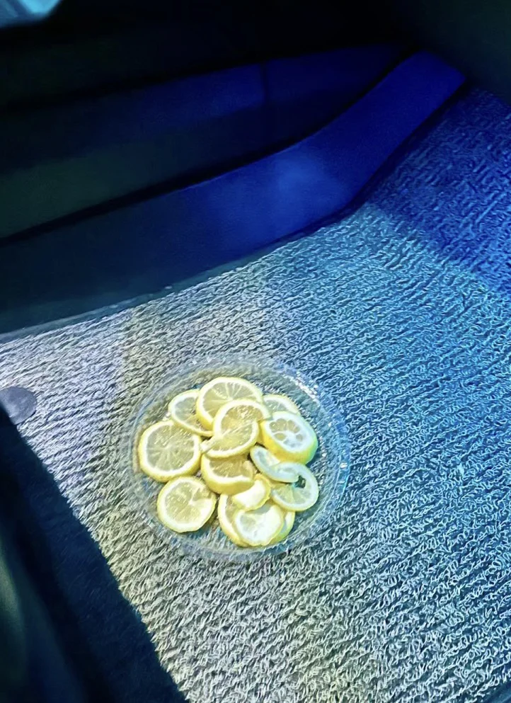 放置活性炭包或者竹炭包,利用炭包大量空腔吸附异味,同时可以放置柚子皮或柠檬片等吸附异味,达到清新车内气味的目的