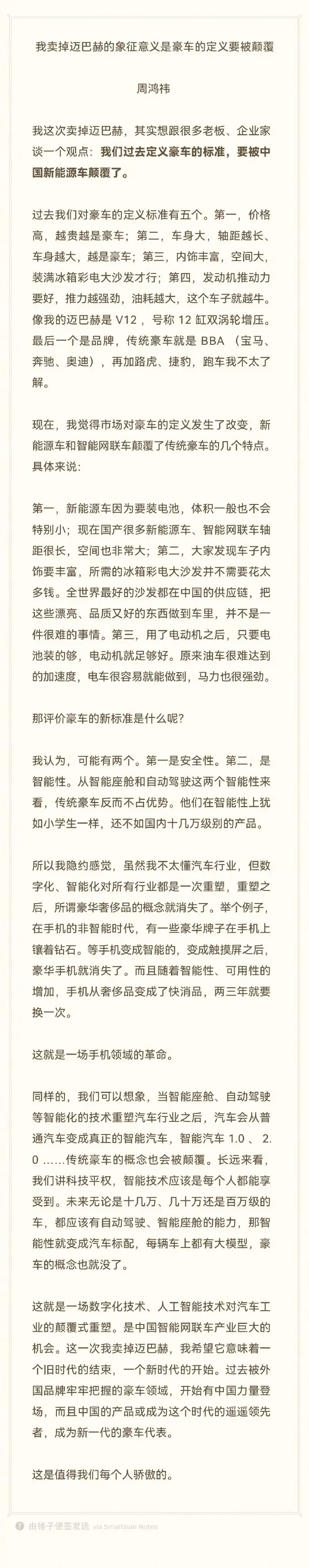 前阵子,互联网大咖周鸿祎先生,卖掉自己使用多年的迈巴赫更换新能源汽车,引发一波热潮。事后周鸿祎先生在微博发了一篇长文,我引用其中一段:“……我这次卖掉迈巴赫,其实想谈一个观点:我们过去定义豪车的标准,要被中国新能源车颠覆了。过去我们对豪车的定义标准有价格高、车身大、内饰丰富、发动机推动力好、品牌等。现在市场对豪车的定义发生了改变。新标准可能有两个:第一是安全性,第二是智能性。这就是一场数字化技术、人工智能技术对汽车工业的颠覆式重塑,是中国智能网联车产业巨大的机会。这一次我卖掉迈巴赫,我希望它意味着一个旧时代的结束,一个新时代的开始……”曾经的互联网诞生出很多叱咤风云的人物,靠360杀毒软件起家,曾经和腾讯引发3Q大战的“红衣主教”周鸿祎就是其中一个,在互联网领域也算是赫赫有名的人物,身为大佬的他换车后说的这番话表达的就是一个观点:燃油豪车时代过去了,现在的豪车看新能源,而智能性是重新定义豪车的一个标准。在新能源造车势力里,各家刚开始选择的道路各自不同,如蔚来走的“换电”道路(曲高和寡);理想走的“舒享”道路(大沙发大彩电大冰箱大空间);零跑是增程和纯电两条腿走路打出“半价理想”的“车设”,走的是性价比;比亚迪主打“刀片电池安全性”以及“DMI插混技术”,同时比亚迪还喊出一个“电比油便宜”的口号,和埃安、哪吒、东风主打一个“网约车”群体,毕竟路上跑的网约车多是它们……小鹏一开始走的就是“智驾”这条路,而从目前来看,这条路是“王道”,不论后面进场的华为还是小米,还是传统大厂比亚迪吉利(领克极氪)长城长安,都开始重点在智驾领域发力。