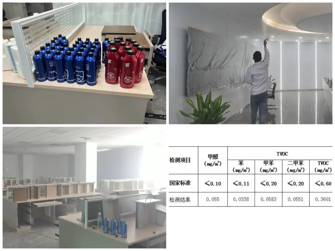 在新车的角落、坐垫等处使用除甲醛喷雾剂,能够在一定程度上去除甲醛、异味。上图是我们单位去年新装修后,用除甲醛喷雾剂做的净化处理,这个工程我参与的,经过了解并实际检测,可以有效去除苯、甲苯、二甲苯、TVOC等有毒害物质!建议:如果有母婴、老人以及对车内空气质量非常高要求的鹏友,可以根据个人需要选择做专业车内净化。