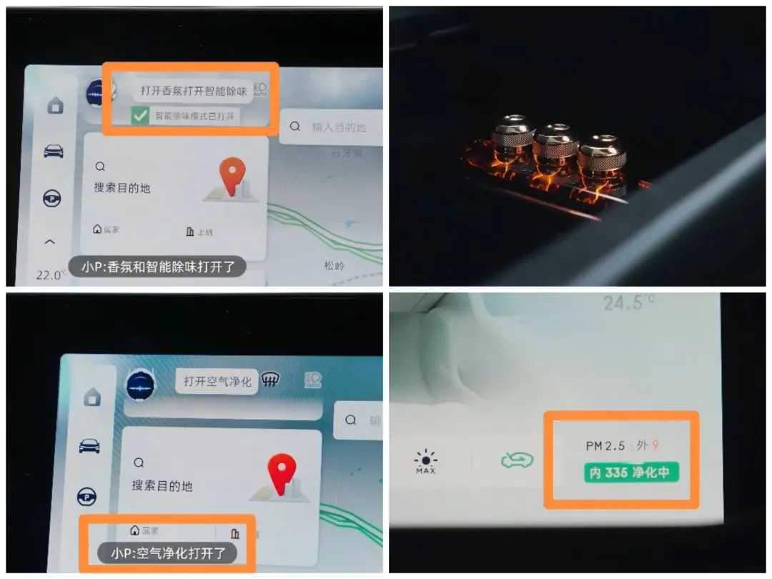 小技巧:我们可以在车上呼叫小P:“打开空气净化”、“打开智能除味”“打开香氛”。请小P帮我们除味哦!